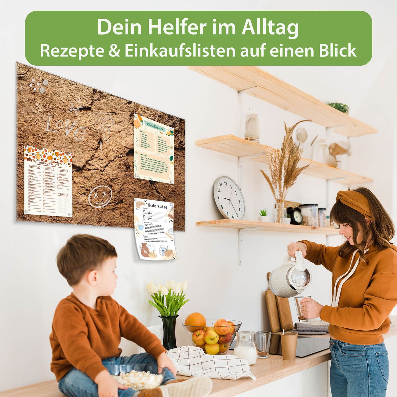 Auf der glatten Glasoberfläche lassen sich Termine, Rezepte oder Notizen ganz einfach mit Kreidestiften festhalten und rückstandslos entfernen. Starke Neodym-Magnete halten Ihre wichtigsten Erinnerungen sicher an Ort und Stelle. So entsteht Ihre ganz persönliche Ideenwand - jeden Tag neu.