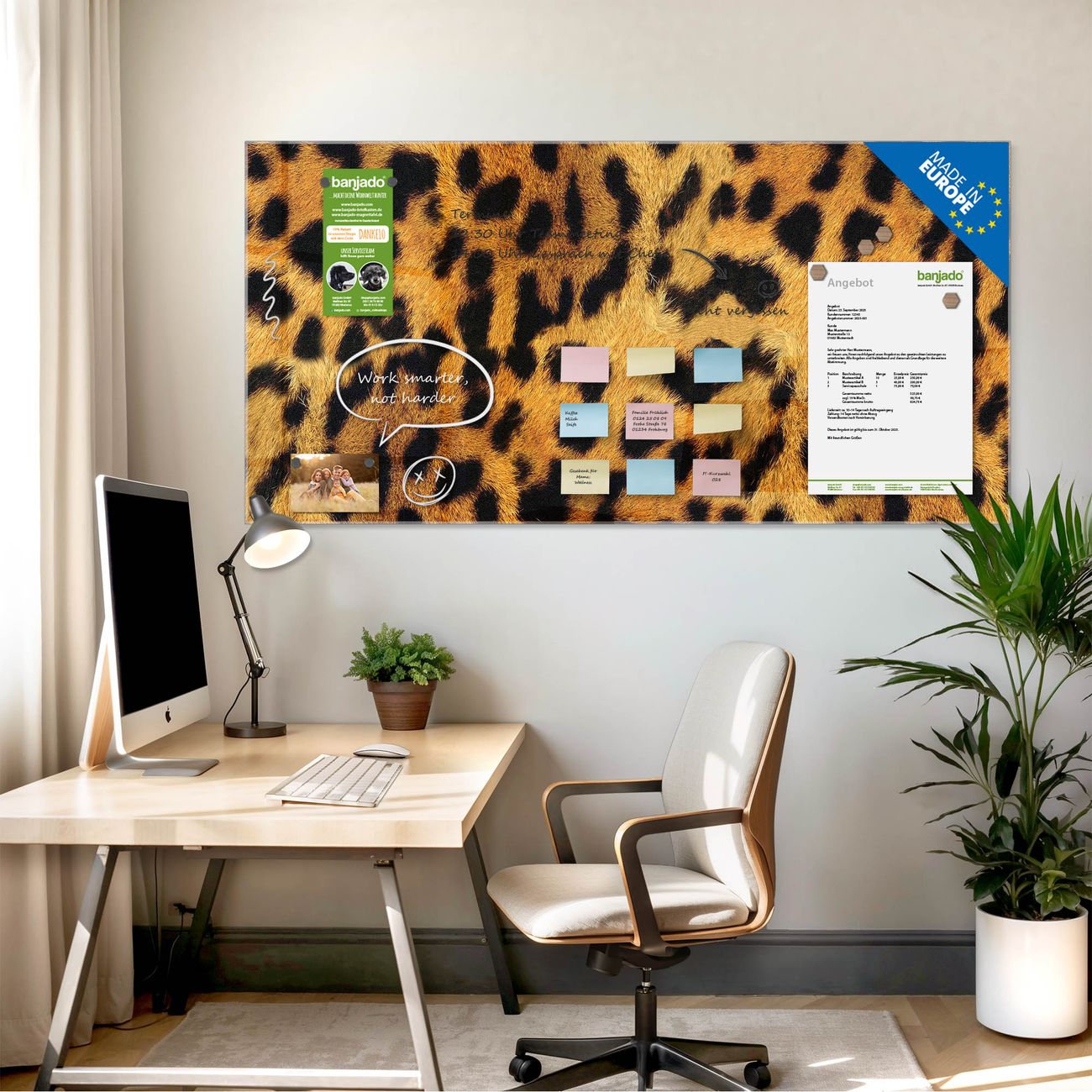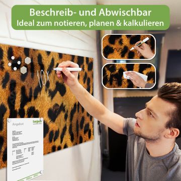 Die banjado Glas Magnettafel mit dem Motiv Motiv Leopard verbindet Funktionalität mit Stil. Sie ersetzt das Zettelchaos durch klare Strukturen und bringt dabei eine warme, natürliche Atmosphäre in Ihr Zuhause. Ob im Büro, in der Küche oder im Eingangsbereich - dieses Design-Board zieht Blicke an und sorgt für Ordnung mit Charakter.
