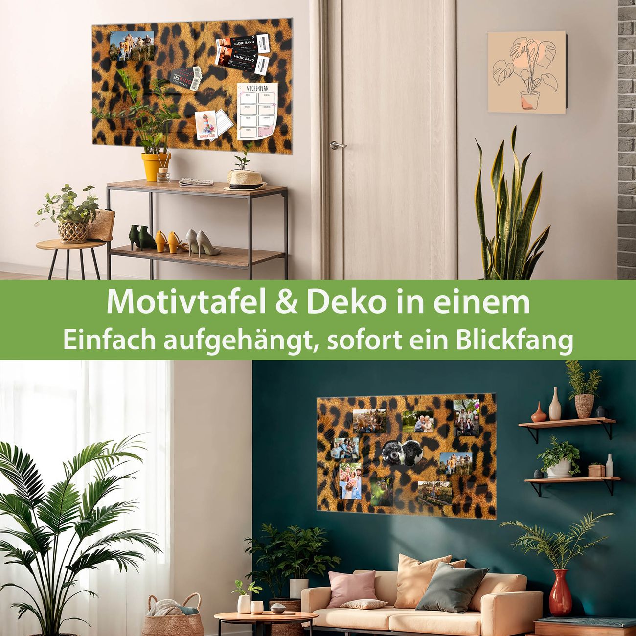 Die banjado Glas Magnettafel mit dem Motiv Motiv Leopard verbindet Funktionalität mit Stil. Sie ersetzt das Zettelchaos durch klare Strukturen und bringt dabei eine warme, natürliche Atmosphäre in Ihr Zuhause. Ob im Büro, in der Küche oder im Eingangsbereich - dieses Design-Board zieht Blicke an und sorgt für Ordnung mit Charakter.