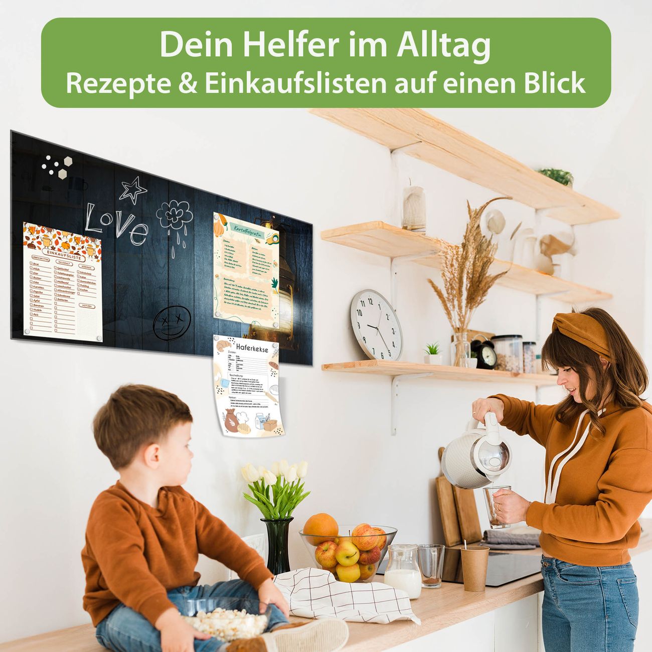 Auf der glatten Glasoberfläche lassen sich Termine, Rezepte oder Notizen ganz einfach mit Kreidestiften festhalten und rückstandslos entfernen. Starke Neodym-Magnete halten Ihre wichtigsten Erinnerungen sicher an Ort und Stelle. So entsteht Ihre ganz persönliche Ideenwand - jeden Tag neu.