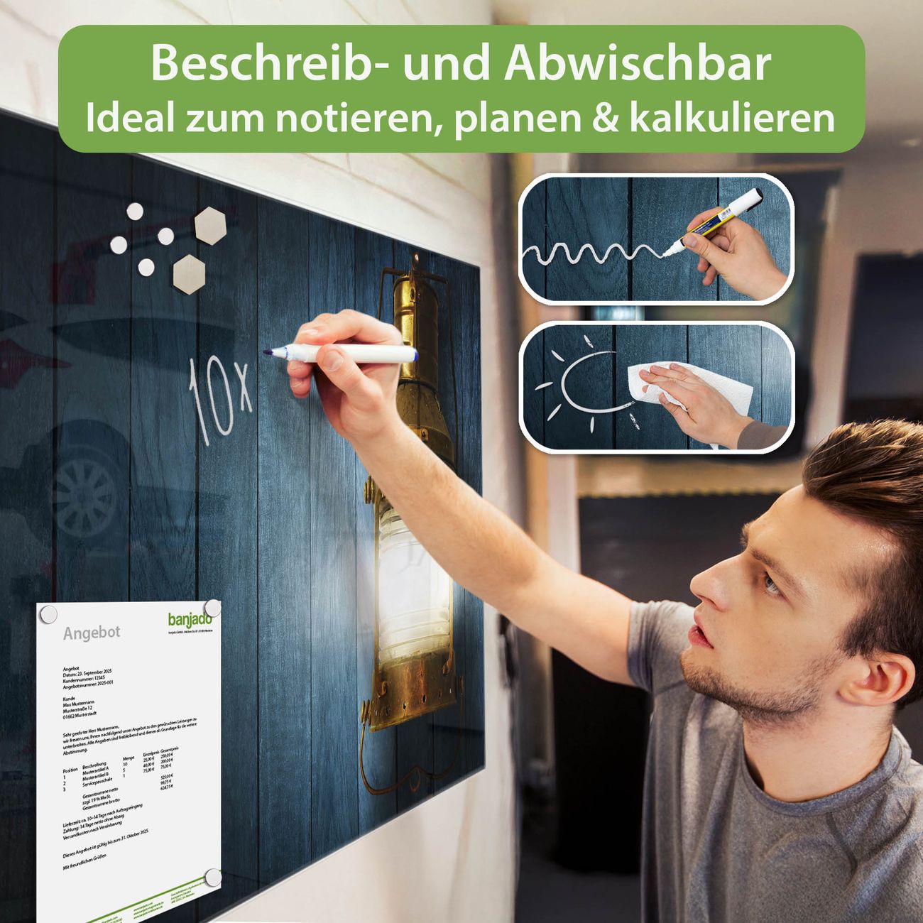Bitte beachten Sie, dass ausschliessliche spezielle Magnete an der Glastafel haften. Wir empfehlen banjado Neodym Magnete, diese sind durch uns auf Wirksamkeit geprüft.