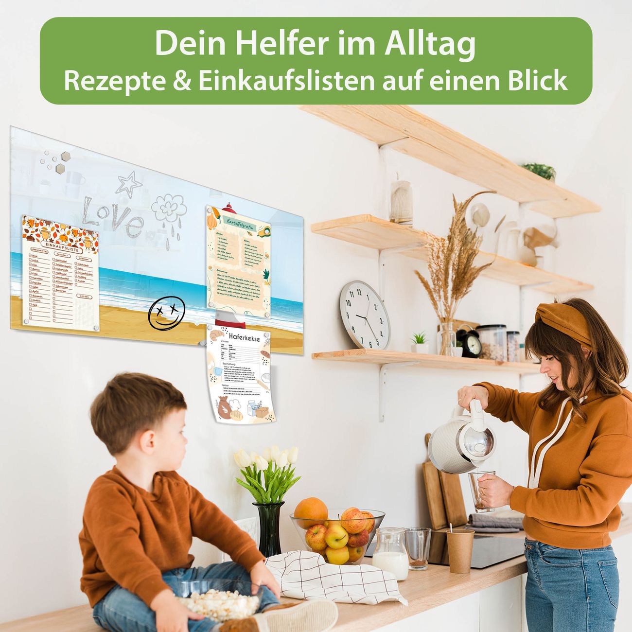 Auf der glatten Glasoberfläche lassen sich Termine, Rezepte oder Notizen ganz einfach mit Kreidestiften festhalten und rückstandslos entfernen. Starke Neodym-Magnete halten Ihre wichtigsten Erinnerungen sicher an Ort und Stelle. So entsteht Ihre ganz persönliche Ideenwand - jeden Tag neu.