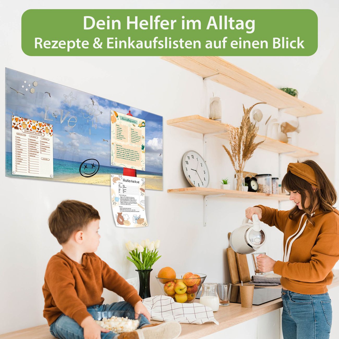 Auf der glatten Glasoberfläche lassen sich Termine, Rezepte oder Notizen ganz einfach mit Kreidestiften festhalten und rückstandslos entfernen. Starke Neodym-Magnete halten Ihre wichtigsten Erinnerungen sicher an Ort und Stelle. So entsteht Ihre ganz persönliche Ideenwand - jeden Tag neu.