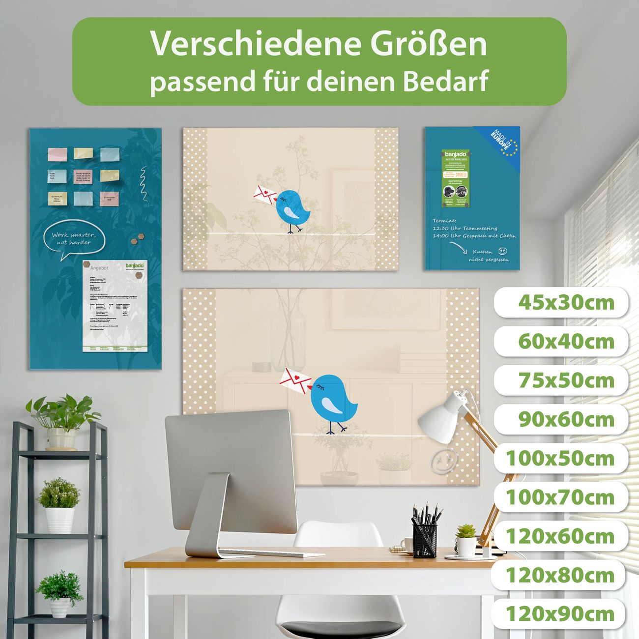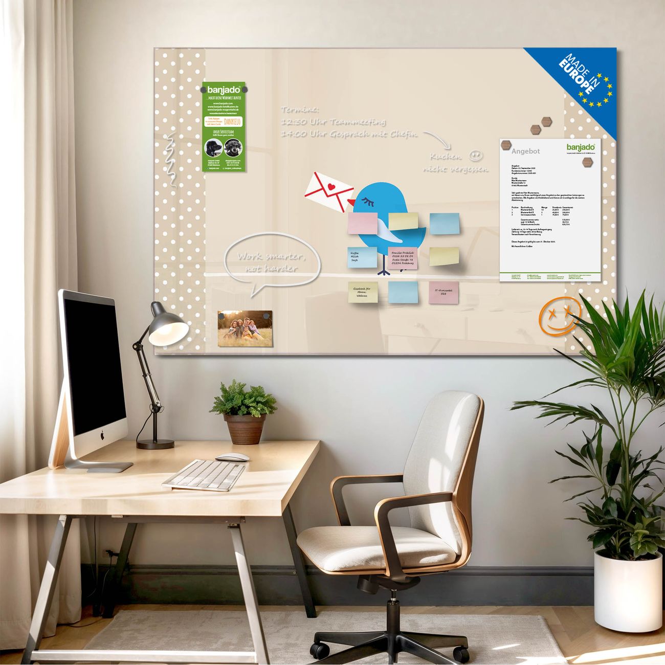 Jede Glas Magnettafel wird in unserer Werkstatt von Hand gefertigt und sorgfältig geprüft. So erhalten Sie ein echtes Qualitätsprodukt, das Funktion und Ästhetik perfekt vereint.?? Warum banjado?