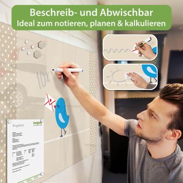 Auf der glatten Glasoberfläche lassen sich Termine, Rezepte oder Notizen ganz einfach mit Kreidestiften festhalten und rückstandslos entfernen. Starke Neodym-Magnete halten Ihre wichtigsten Erinnerungen sicher an Ort und Stelle. So entsteht Ihre ganz persönliche Ideenwand - jeden Tag neu.