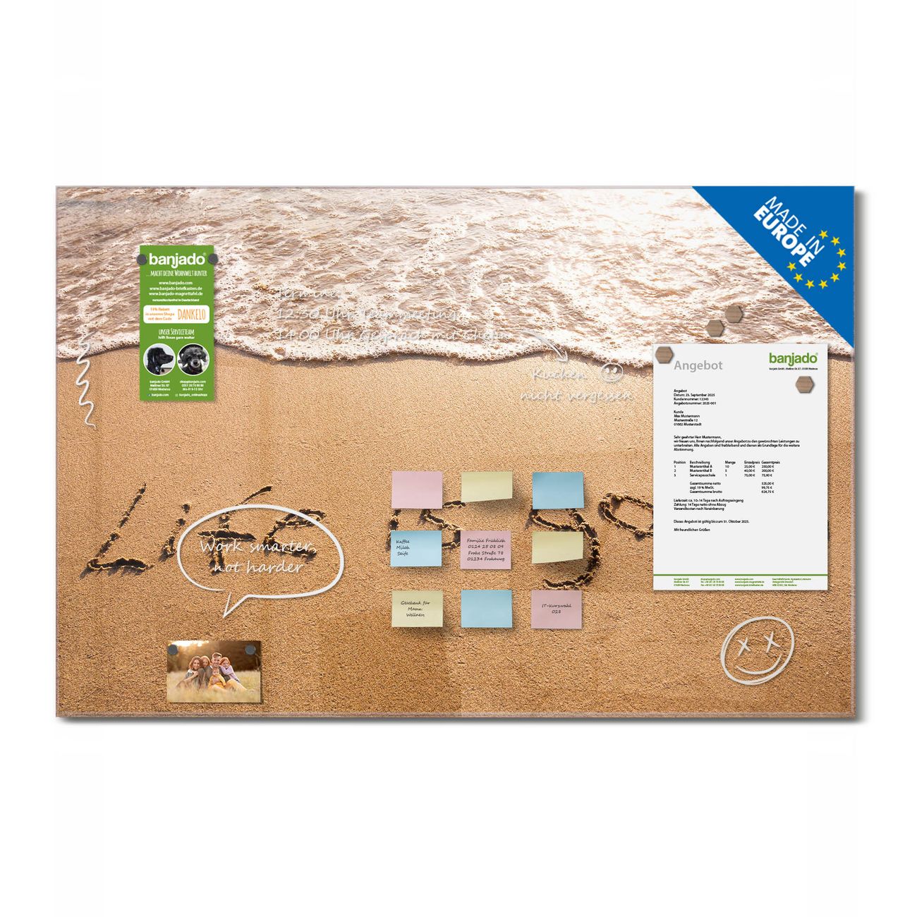 Jede Glas Magnettafel wird in unserer Werkstatt von Hand gefertigt und sorgfältig geprüft. So erhalten Sie ein echtes Qualitätsprodukt, das Funktion und Ästhetik perfekt vereint.?? Warum banjado?