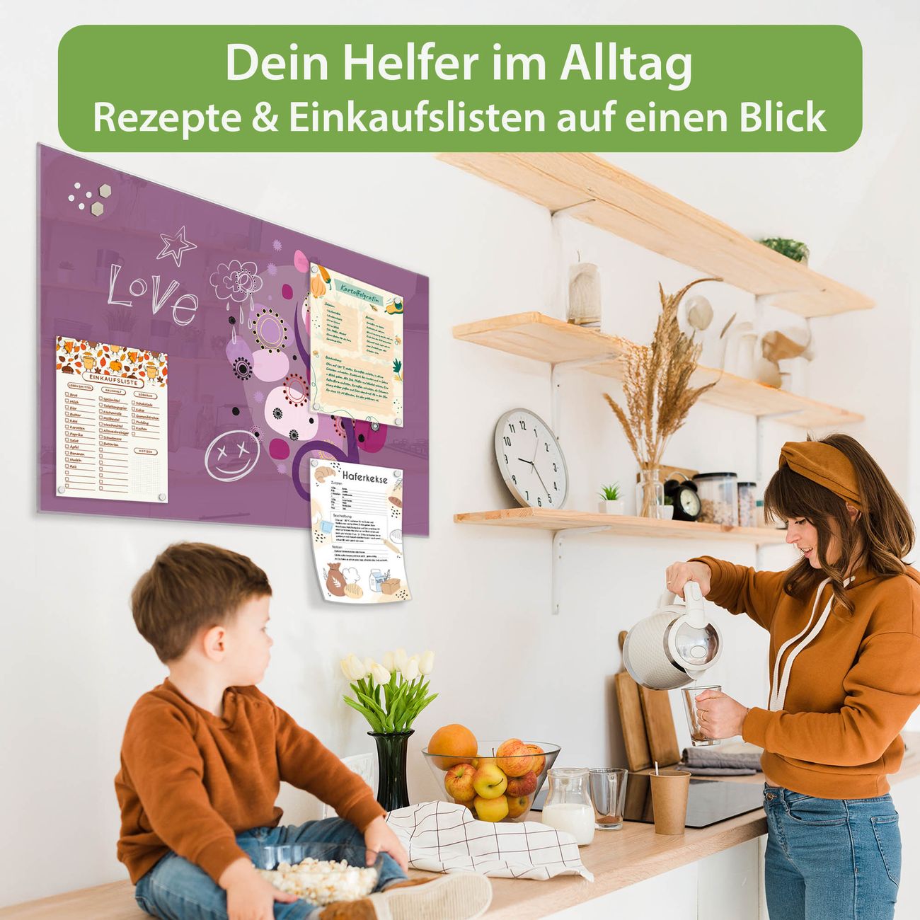 Auf der glatten Glasoberfläche lassen sich Termine, Rezepte oder Notizen ganz einfach mit Kreidestiften festhalten und rückstandslos entfernen. Starke Neodym-Magnete halten Ihre wichtigsten Erinnerungen sicher an Ort und Stelle. So entsteht Ihre ganz persönliche Ideenwand - jeden Tag neu.