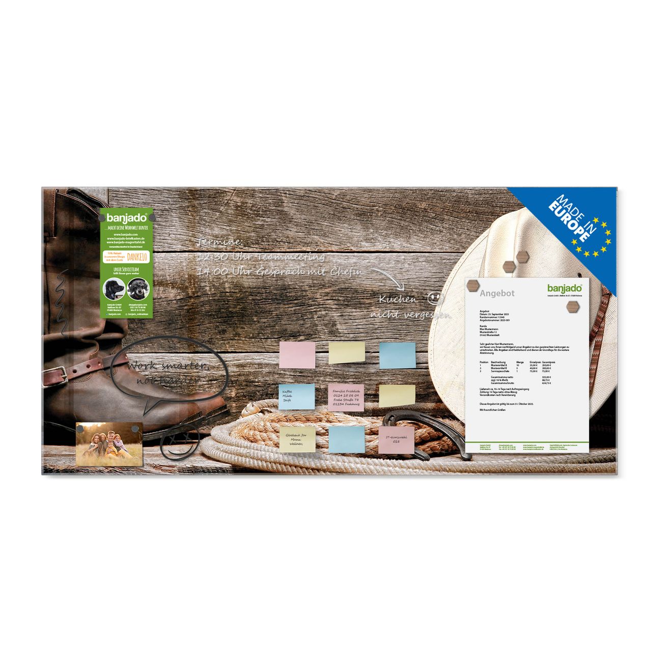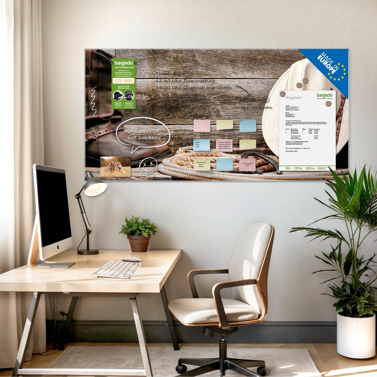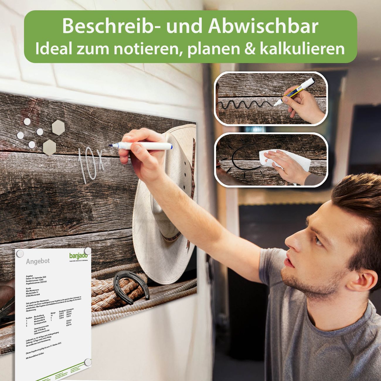 Jede Glas Magnettafel wird in unserer Werkstatt von Hand gefertigt und sorgfältig geprüft. So erhalten Sie ein echtes Qualitätsprodukt, das Funktion und Ästhetik perfekt vereint.?? Warum banjado?