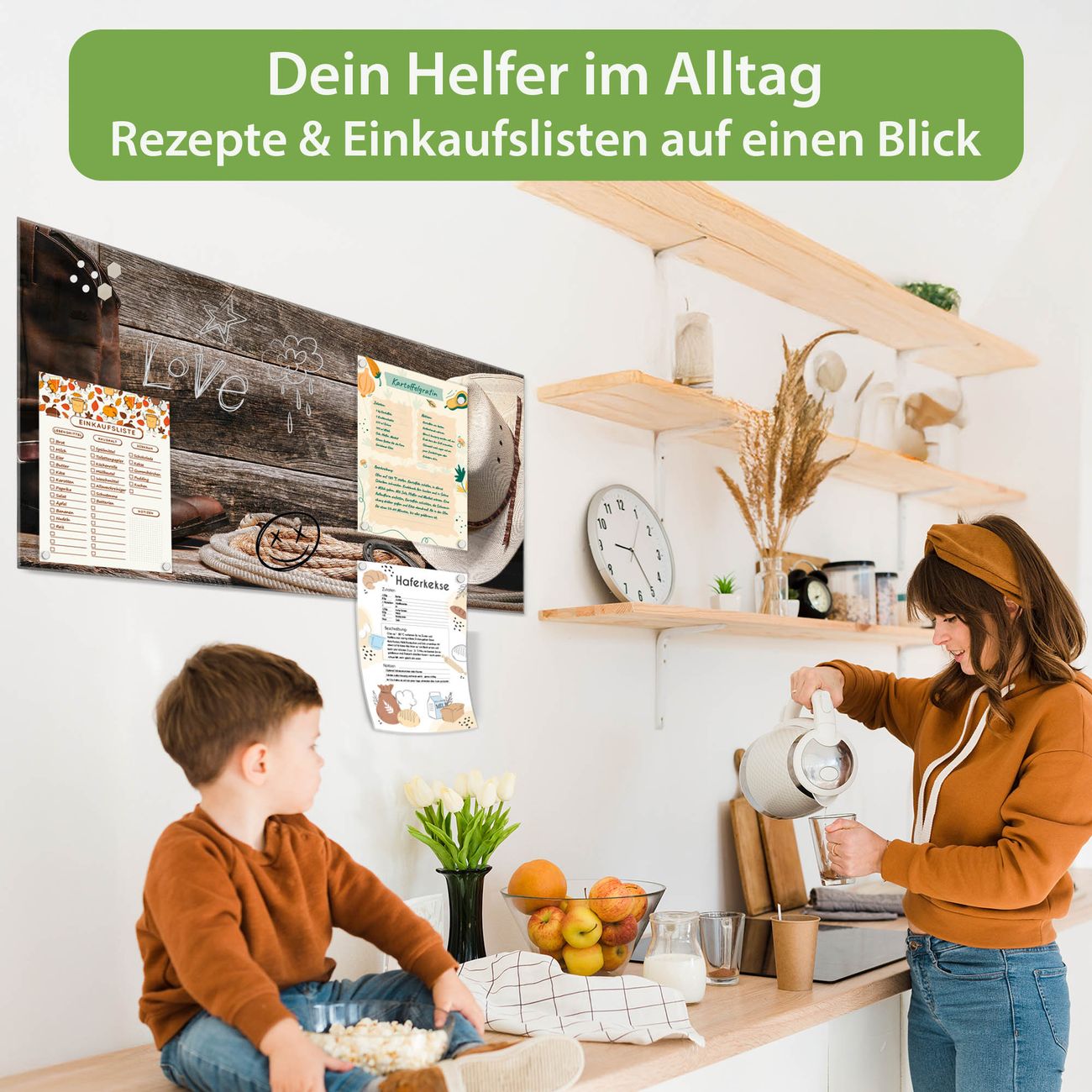 Auf der glatten Glasoberfläche lassen sich Termine, Rezepte oder Notizen ganz einfach mit Kreidestiften festhalten und rückstandslos entfernen. Starke Neodym-Magnete halten Ihre wichtigsten Erinnerungen sicher an Ort und Stelle. So entsteht Ihre ganz persönliche Ideenwand - jeden Tag neu.