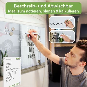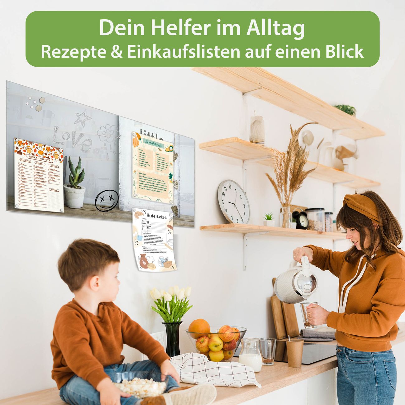 Auf der glatten Glasoberfläche lassen sich Termine, Rezepte oder Notizen ganz einfach mit Kreidestiften festhalten und rückstandslos entfernen. Starke Neodym-Magnete halten Ihre wichtigsten Erinnerungen sicher an Ort und Stelle. So entsteht Ihre ganz persönliche Ideenwand - jeden Tag neu.