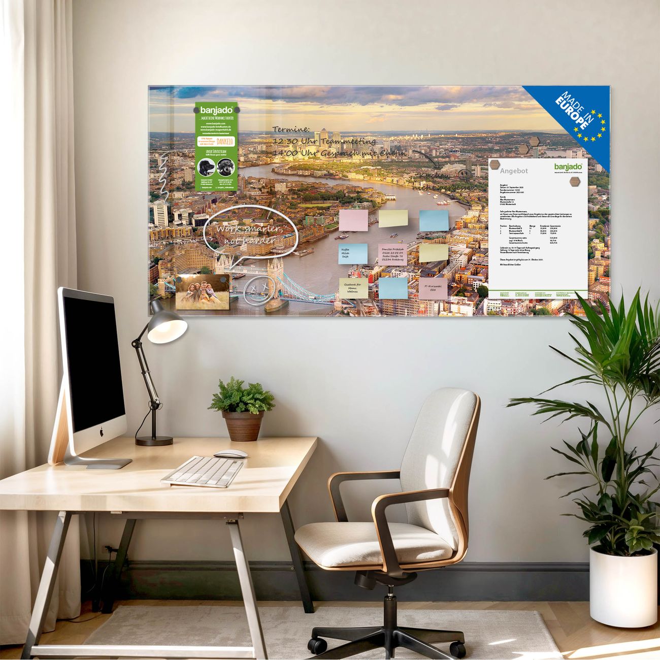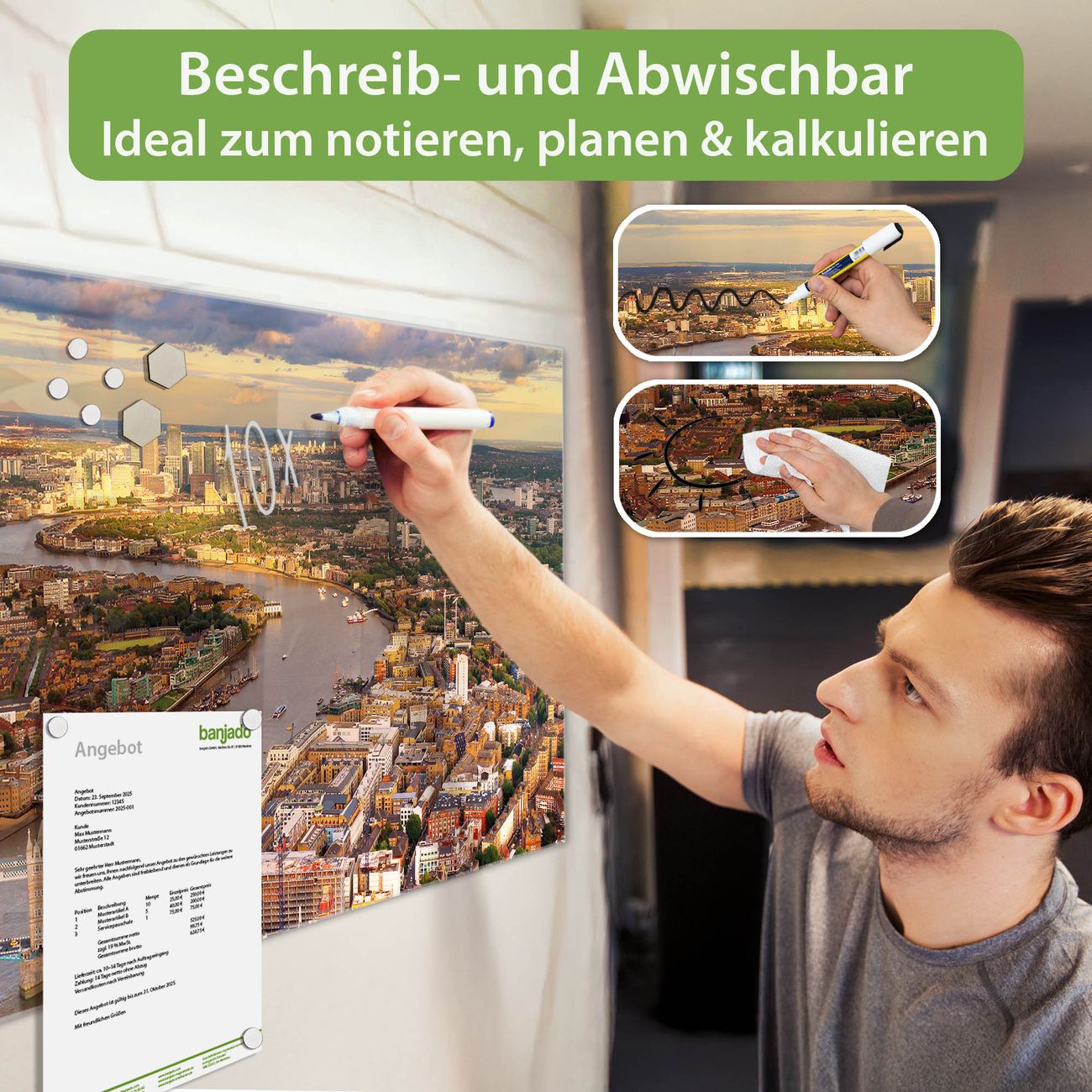 Jede Glas Magnettafel wird in unserer Werkstatt von Hand gefertigt und sorgfältig geprüft. So erhalten Sie ein echtes Qualitätsprodukt, das Funktion und Ästhetik perfekt vereint.?? Warum banjado?