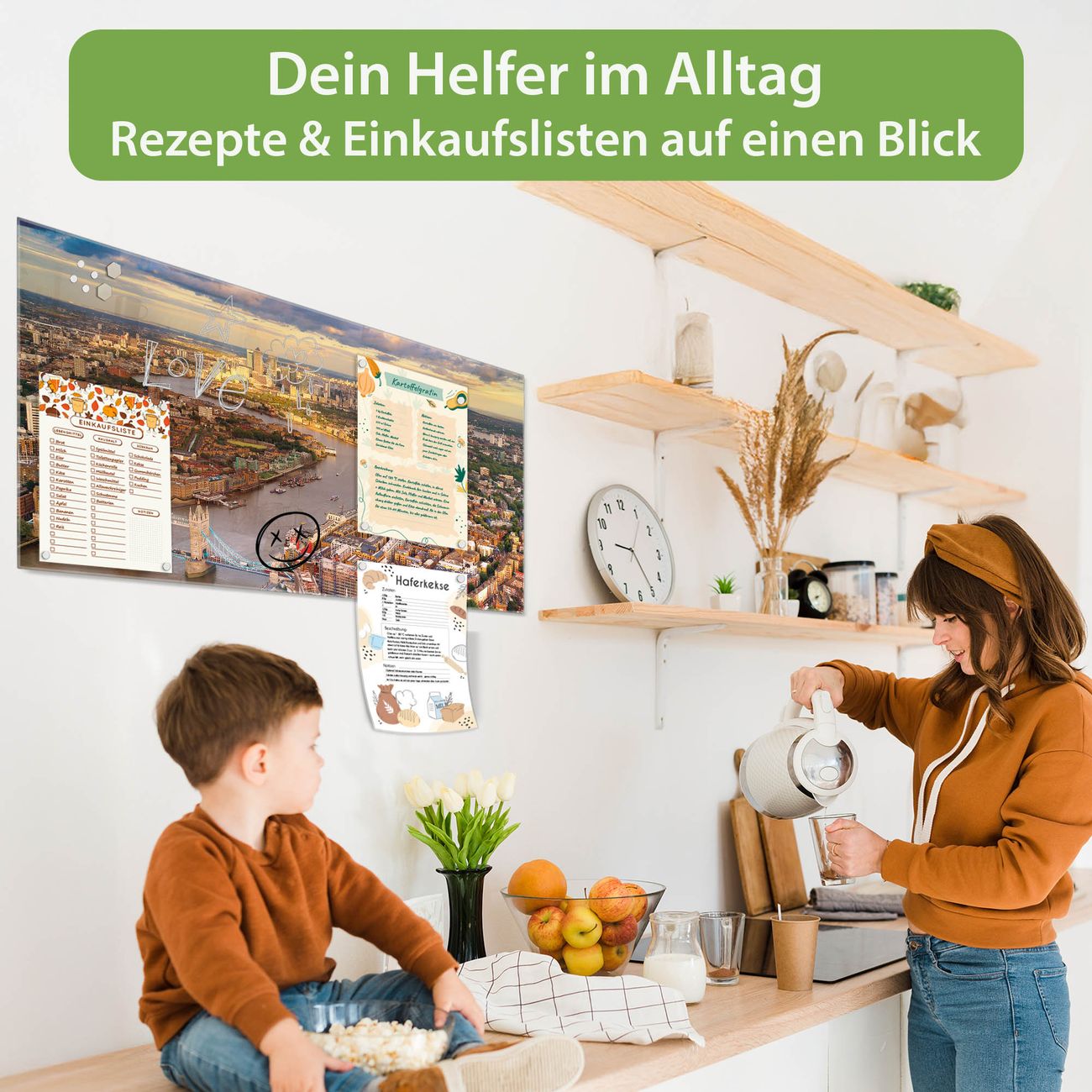 Auf der glatten Glasoberfläche lassen sich Termine, Rezepte oder Notizen ganz einfach mit Kreidestiften festhalten und rückstandslos entfernen. Starke Neodym-Magnete halten Ihre wichtigsten Erinnerungen sicher an Ort und Stelle. So entsteht Ihre ganz persönliche Ideenwand - jeden Tag neu.