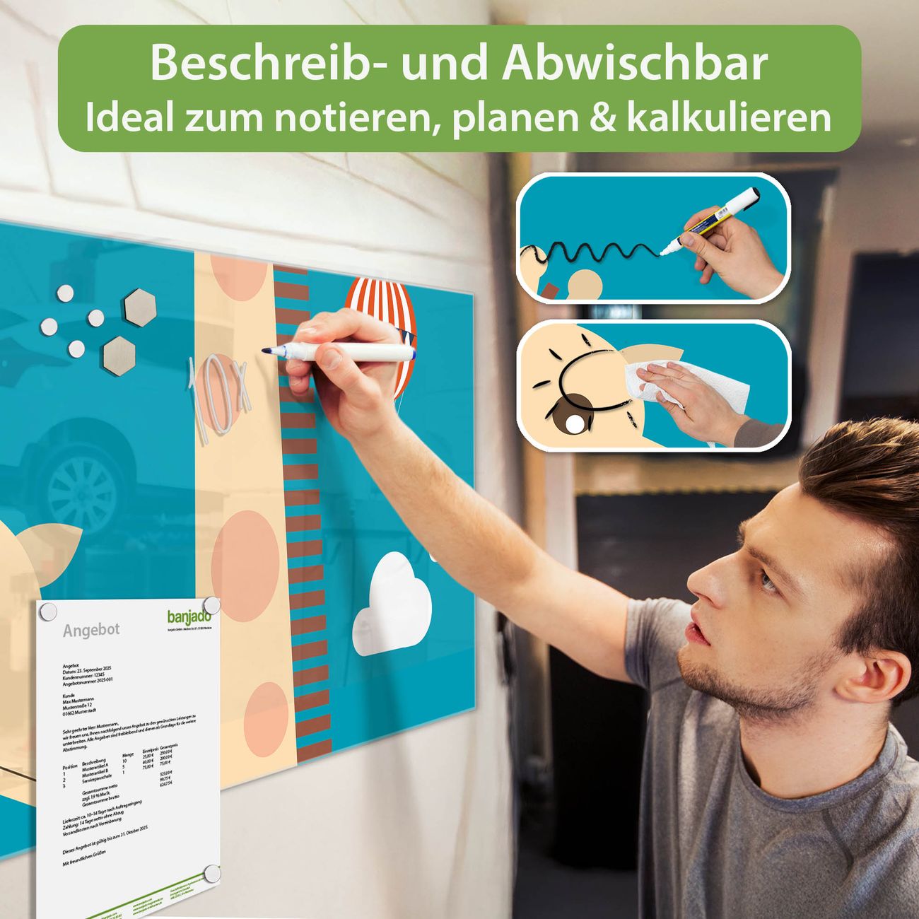 Jede Glas Magnettafel wird in unserer Werkstatt von Hand gefertigt und sorgfältig geprüft. So erhalten Sie ein echtes Qualitätsprodukt, das Funktion und Ästhetik perfekt vereint.?? Warum banjado?