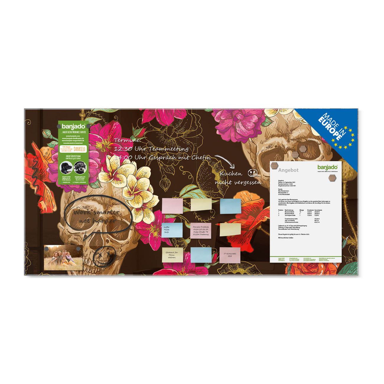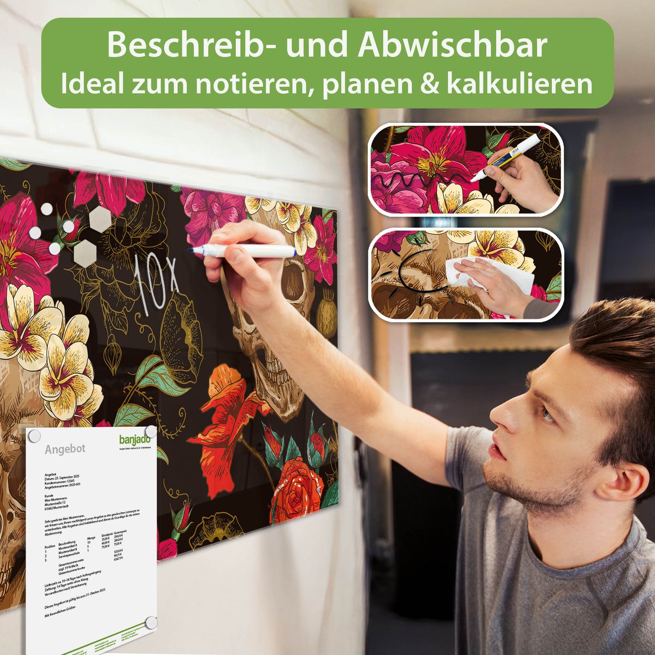 Die banjado Glas Magnettafel mit dem Motiv Motiv Los Dias de Muertos verbindet Funktionalität mit Stil. Sie ersetzt das Zettelchaos durch klare Strukturen und bringt dabei eine warme, natürliche Atmosphäre in Ihr Zuhause. Ob im Büro, in der Küche oder im Eingangsbereich - dieses Design-Board zieht Blicke an und sorgt für Ordnung mit Charakter.