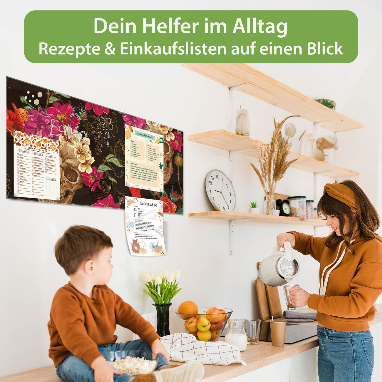Ein Stück Design, das Ihren Alltag organisiert. Schreiben, heften, inspirieren - alles an einem Ort. Qualität, die man spürt. Montage leicht gemacht. Handwerk mit Herz - veredelt in Sachsen. Einzigartiges Design mit Motiv Motiv Los Dias de Muertos Beschreibbare Glasoberfläche, leicht zu reinigen Starke Magnetkraft durch Stahlrückwand Inklusive 4 Neodym-Magneten Flexible Montageoptionen Handveredelt in Sachsen - Qualität, die bleibt
