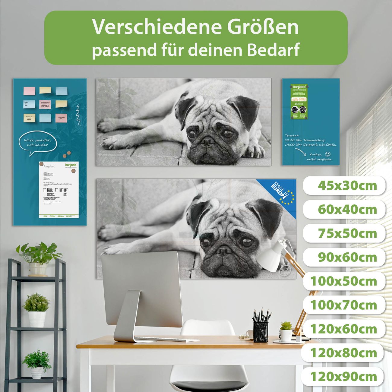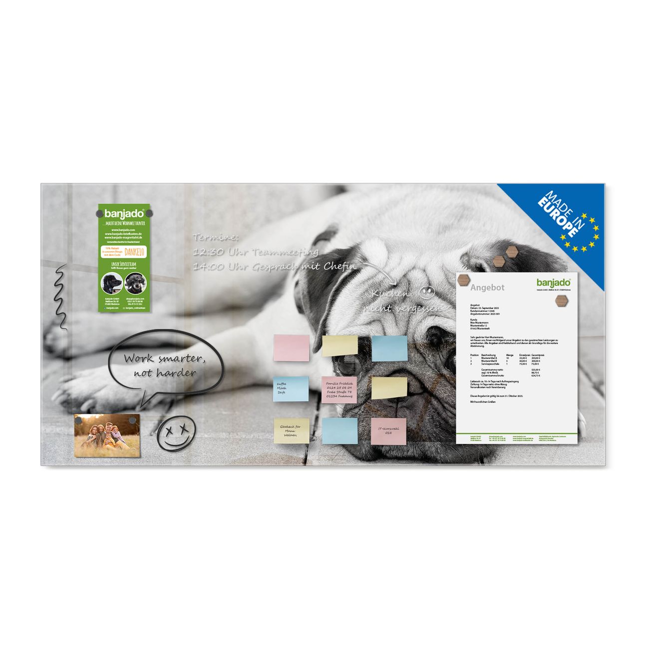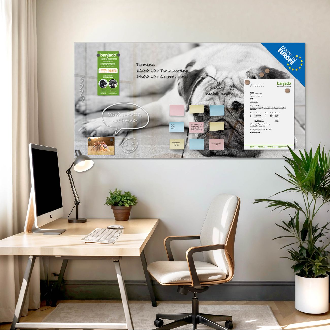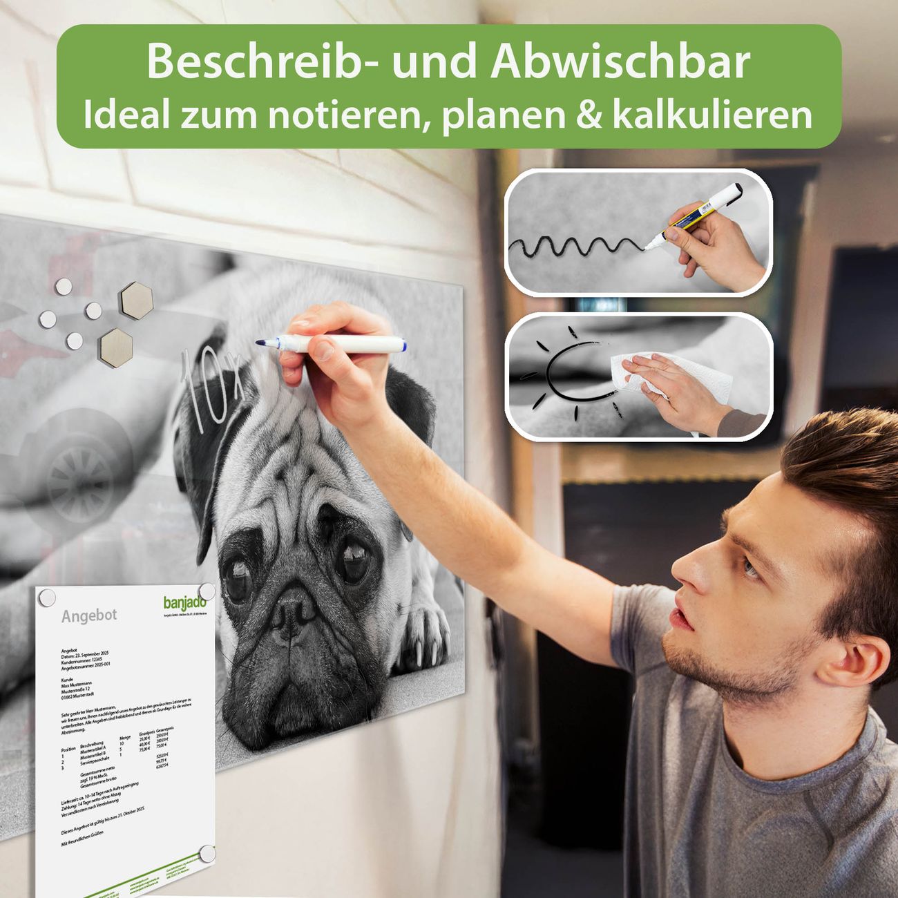 Jede Glas Magnettafel wird in unserer Werkstatt von Hand gefertigt und sorgfältig geprüft. So erhalten Sie ein echtes Qualitätsprodukt, das Funktion und Ästhetik perfekt vereint.?? Warum banjado?