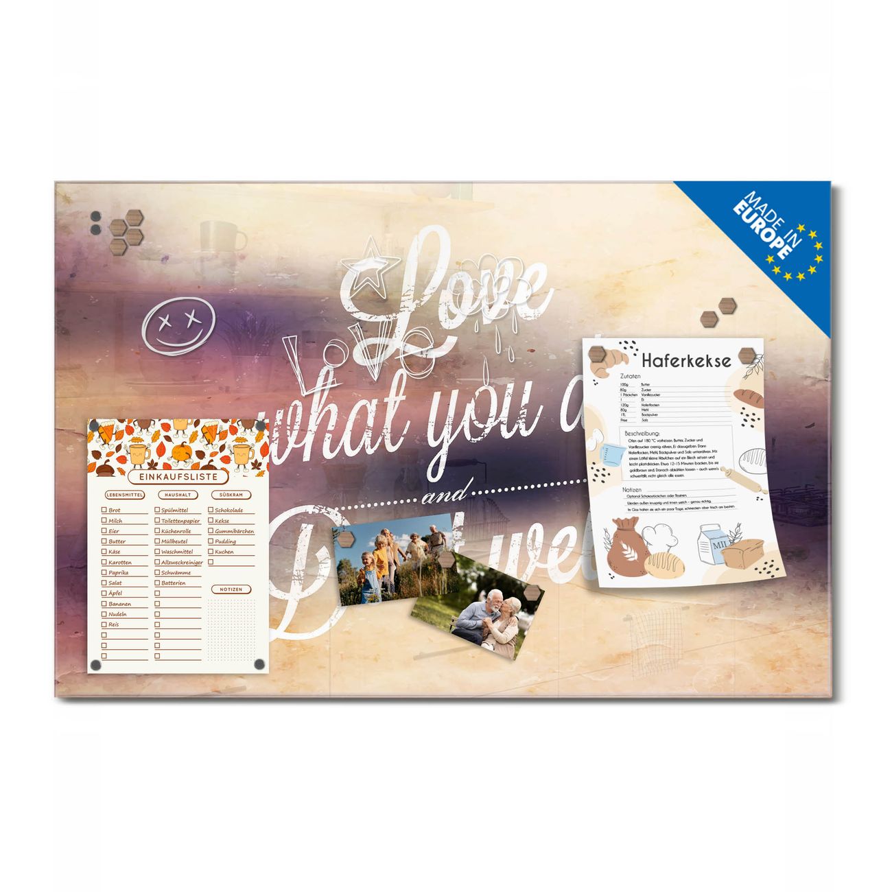 Ein Stück Design, das Ihren Alltag organisiert. Schreiben, heften, inspirieren - alles an einem Ort. Qualität, die man spürt. Montage leicht gemacht. Handwerk mit Herz - veredelt in Sachsen. Einzigartiges Design mit Motiv Motiv Love What You Do Beschreibbare Glasoberfläche, leicht zu reinigen Starke Magnetkraft durch Stahlrückwand Inklusive 4 Neodym-Magneten Flexible Montageoptionen Handveredelt in Sachsen - Qualität, die bleibt