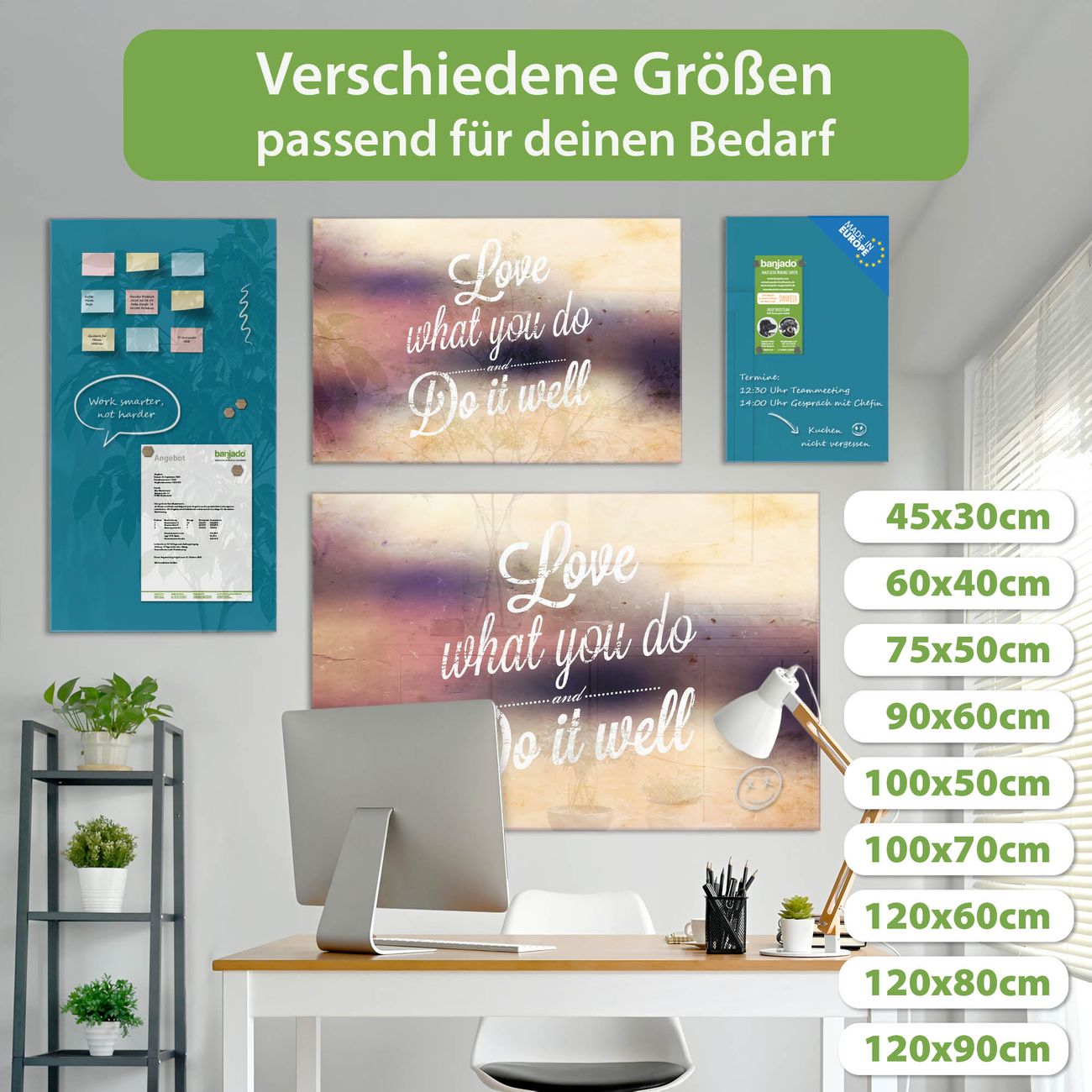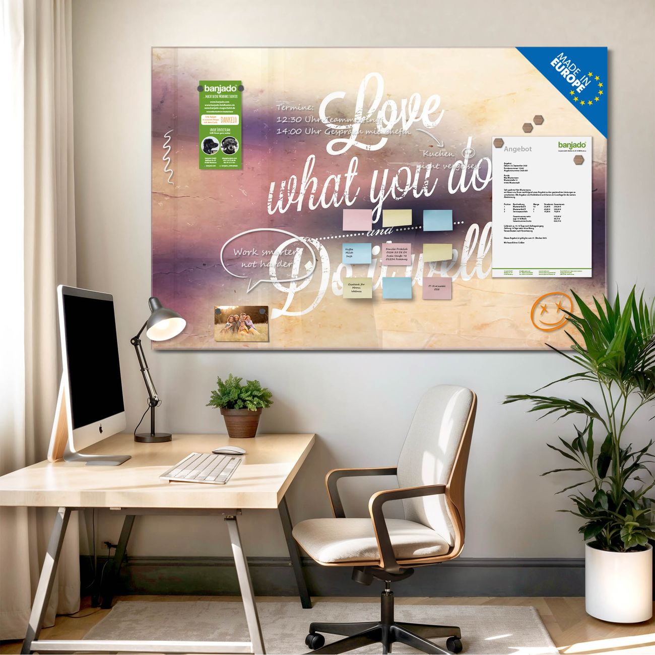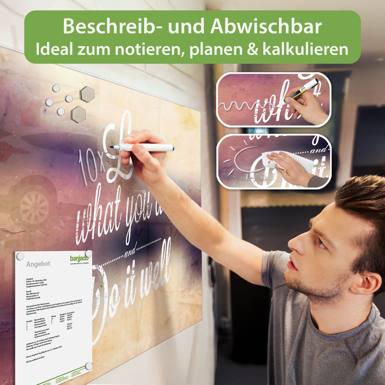Jede Glas Magnettafel wird in unserer Werkstatt von Hand gefertigt und sorgfältig geprüft. So erhalten Sie ein echtes Qualitätsprodukt, das Funktion und Ästhetik perfekt vereint.?? Warum banjado?