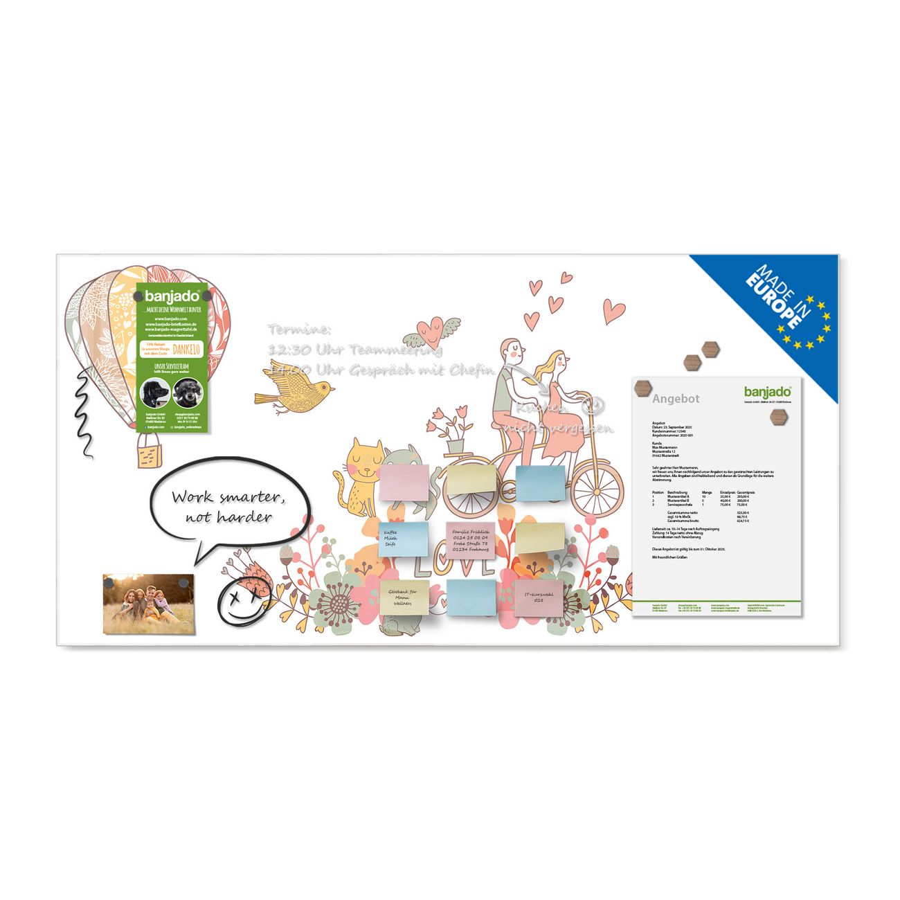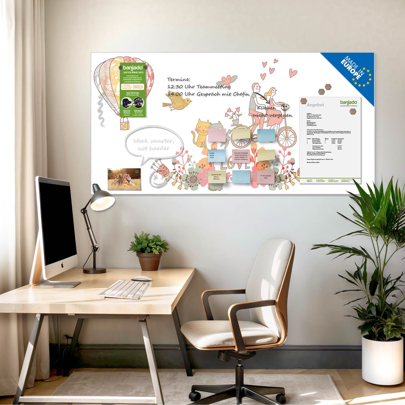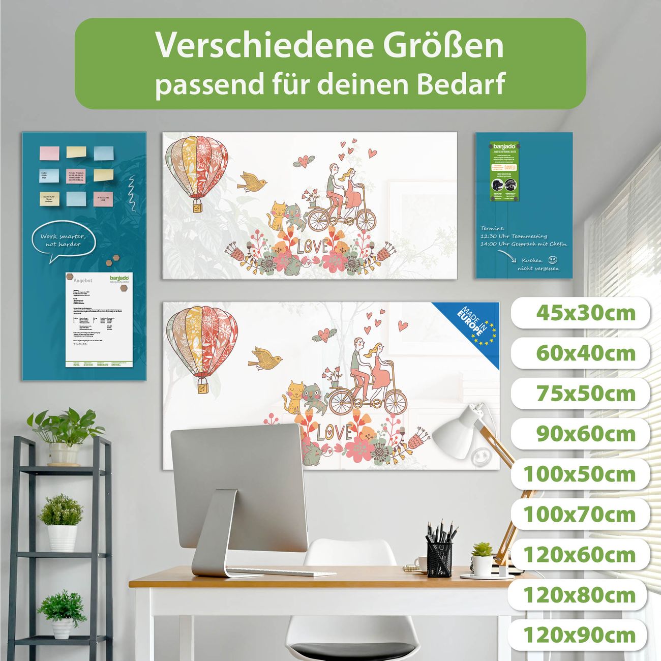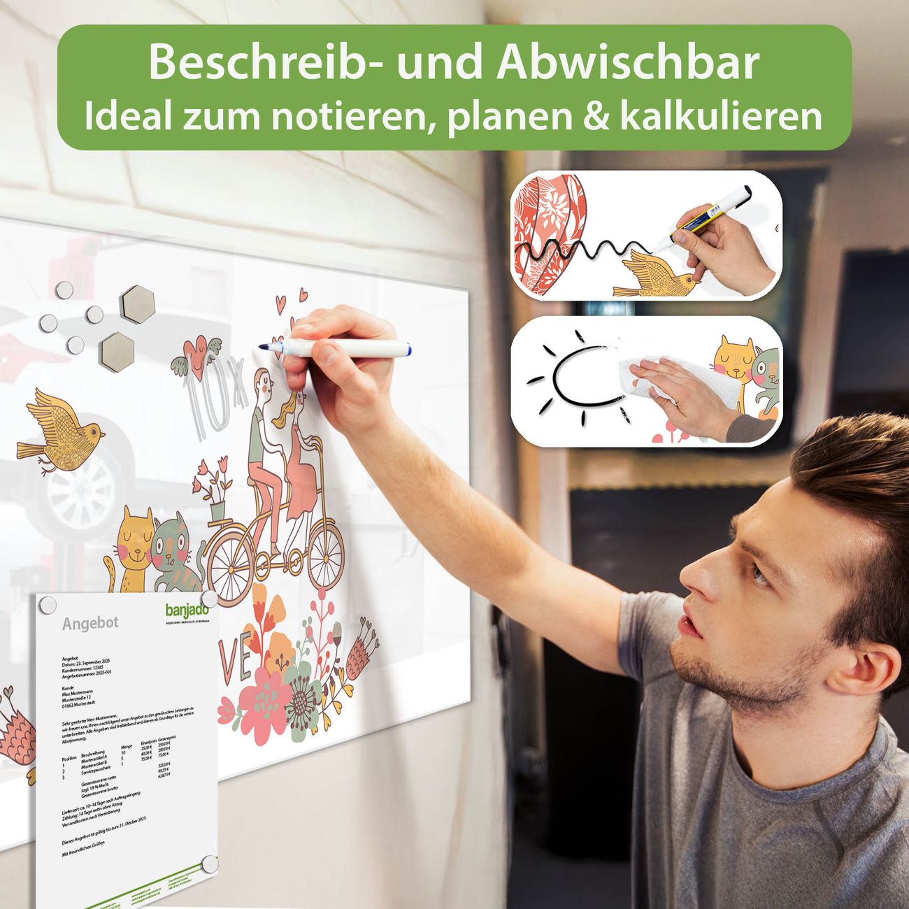 Jede Glas Magnettafel wird in unserer Werkstatt von Hand gefertigt und sorgfältig geprüft. So erhalten Sie ein echtes Qualitätsprodukt, das Funktion und Ästhetik perfekt vereint.?? Warum banjado?