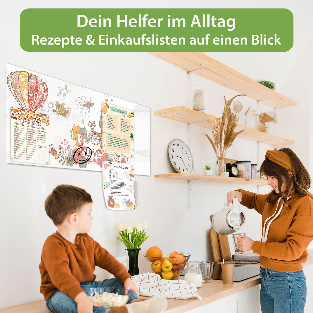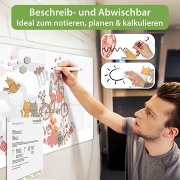 Auf der glatten Glasoberfläche lassen sich Termine, Rezepte oder Notizen ganz einfach mit Kreidestiften festhalten und rückstandslos entfernen. Starke Neodym-Magnete halten Ihre wichtigsten Erinnerungen sicher an Ort und Stelle. So entsteht Ihre ganz persönliche Ideenwand - jeden Tag neu.
