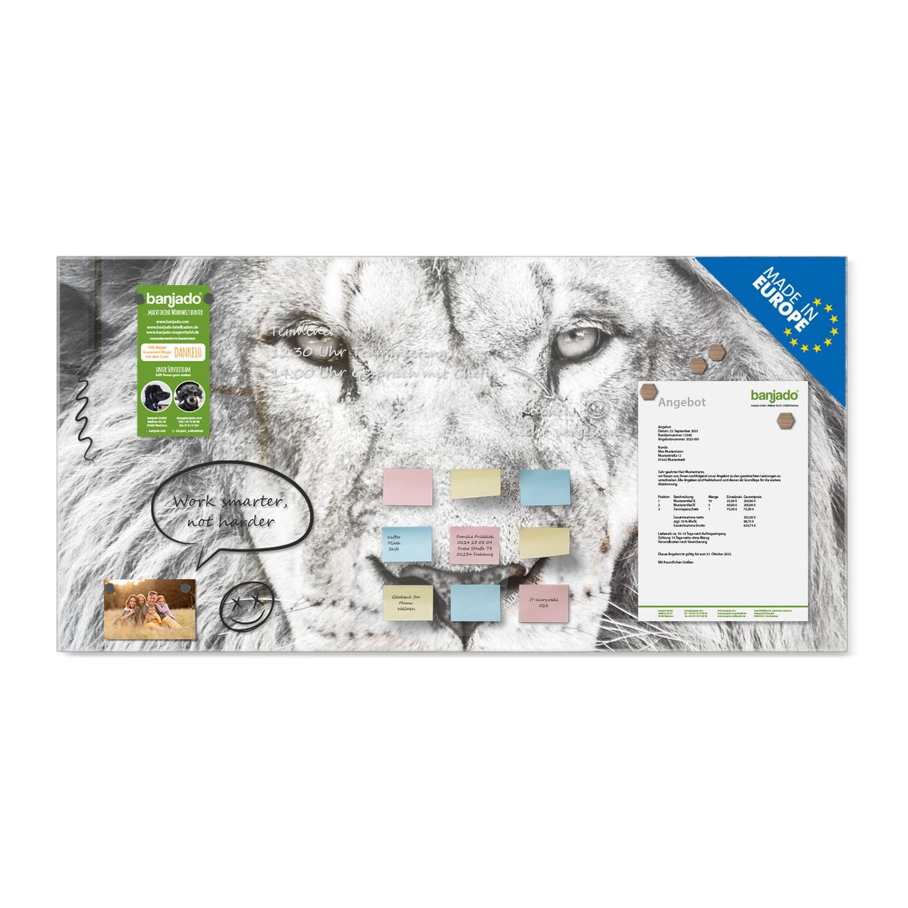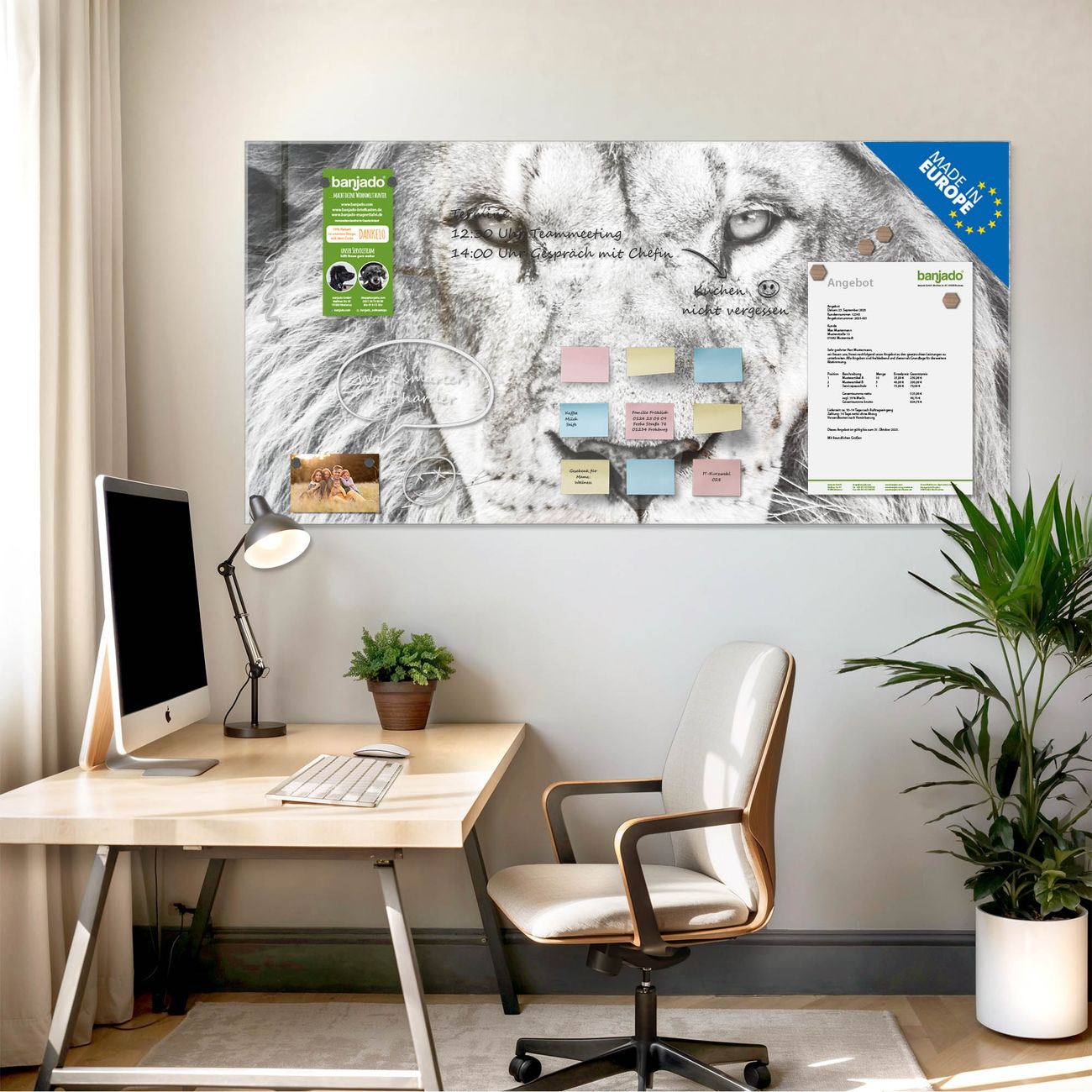 Jede Glas Magnettafel wird in unserer Werkstatt von Hand gefertigt und sorgfältig geprüft. So erhalten Sie ein echtes Qualitätsprodukt, das Funktion und Ästhetik perfekt vereint.?? Warum banjado?