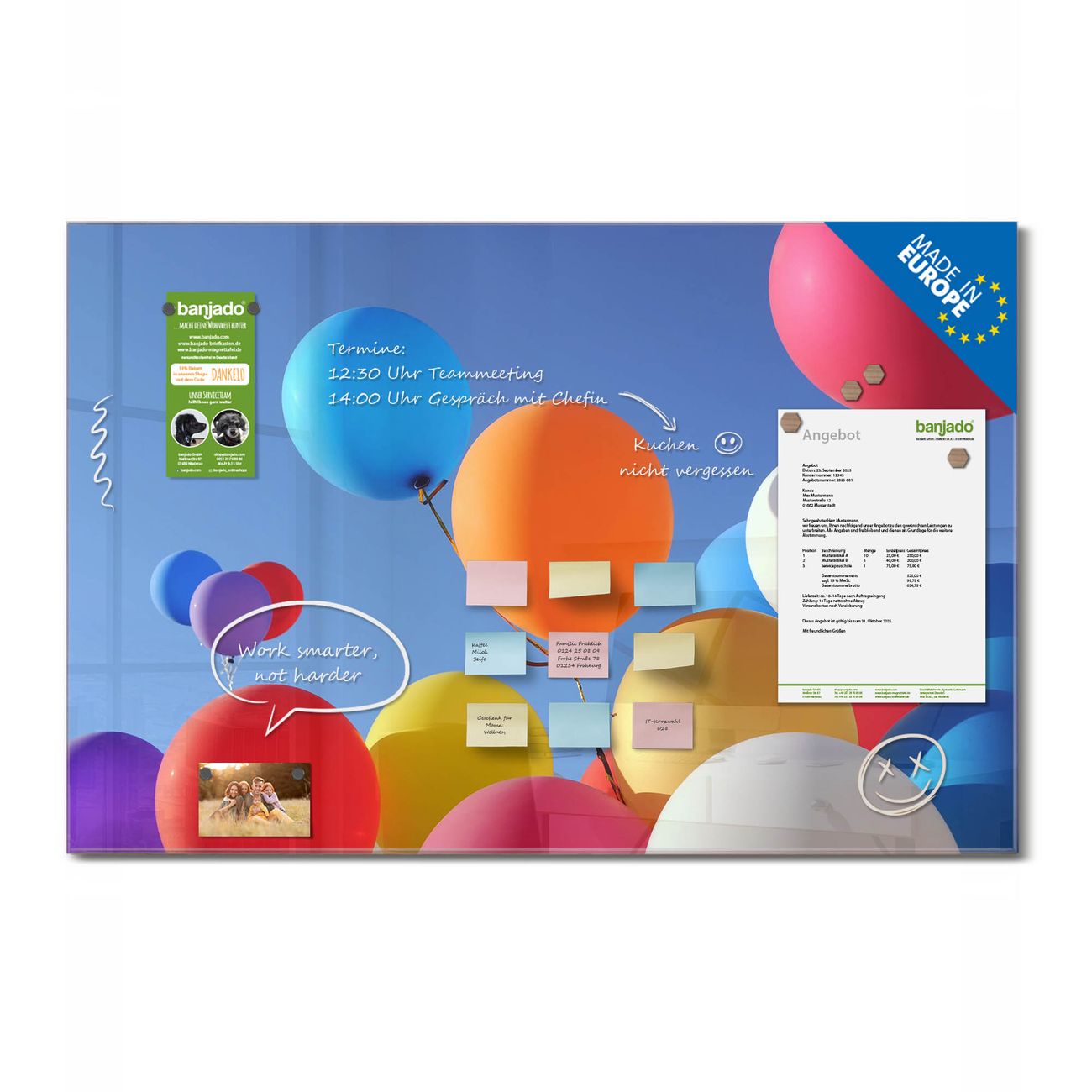 Ein Stück Design, das Ihren Alltag organisiert. Schreiben, heften, inspirieren - alles an einem Ort. Qualität, die man spürt. Montage leicht gemacht. Handwerk mit Herz - veredelt in Sachsen. Einzigartiges Design mit Motiv Motiv Luftballons Beschreibbare Glasoberfläche, leicht zu reinigen Starke Magnetkraft durch Stahlrückwand Inklusive 4 Neodym-Magneten Flexible Montageoptionen Handveredelt in Sachsen - Qualität, die bleibt