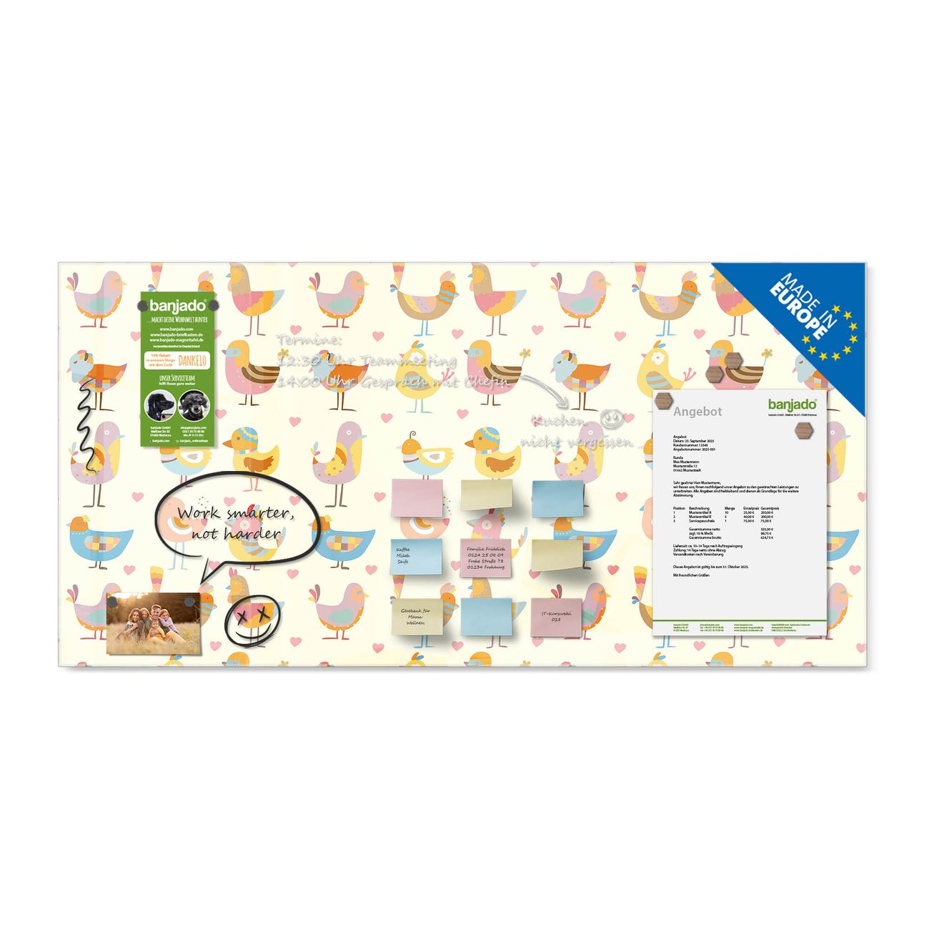 Ein Stück Design, das Ihren Alltag organisiert. Schreiben, heften, inspirieren - alles an einem Ort. Qualität, die man spürt. Montage leicht gemacht. Handwerk mit Herz - veredelt in Sachsen. Einzigartiges Design mit Motiv Motiv Lustige Vögel Beschreibbare Glasoberfläche, leicht zu reinigen Starke Magnetkraft durch Stahlrückwand Inklusive 4 Neodym-Magneten Flexible Montageoptionen Handveredelt in Sachsen - Qualität, die bleibt