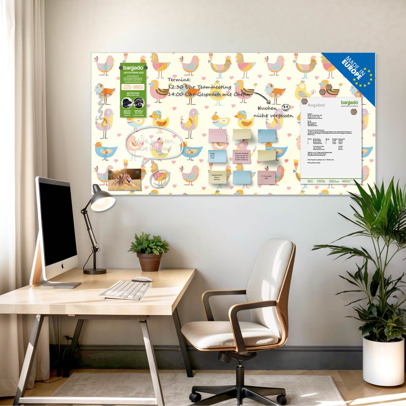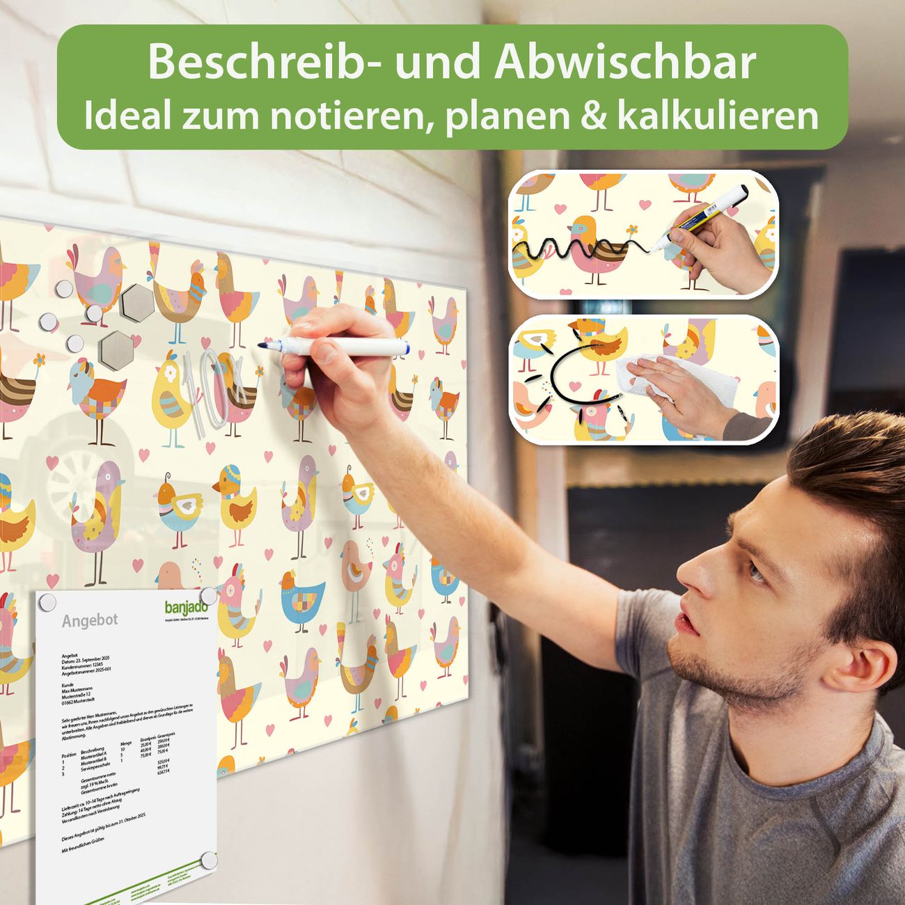 Jede Glas Magnettafel wird in unserer Werkstatt von Hand gefertigt und sorgfältig geprüft. So erhalten Sie ein echtes Qualitätsprodukt, das Funktion und Ästhetik perfekt vereint.?? Warum banjado?