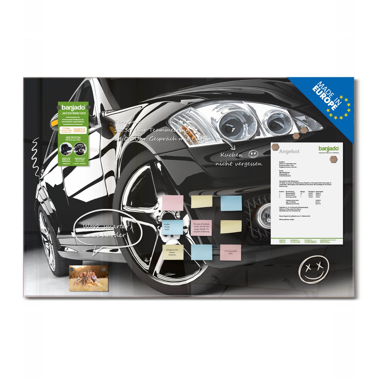 Ein Stück Design, das Ihren Alltag organisiert. Schreiben, heften, inspirieren - alles an einem Ort. Qualität, die man spürt. Montage leicht gemacht. Handwerk mit Herz - veredelt in Sachsen. Einzigartiges Design mit Motiv Motiv Luxus Car Beschreibbare Glasoberfläche, leicht zu reinigen Starke Magnetkraft durch Stahlrückwand Inklusive 4 Neodym-Magneten Flexible Montageoptionen Handveredelt in Sachsen - Qualität, die bleibt
