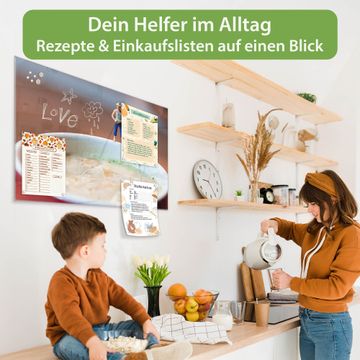 Auf der glatten Glasoberfläche lassen sich Termine, Rezepte oder Notizen ganz einfach mit Kreidestiften festhalten und rückstandslos entfernen. Starke Neodym-Magnete halten Ihre wichtigsten Erinnerungen sicher an Ort und Stelle. So entsteht Ihre ganz persönliche Ideenwand - jeden Tag neu.