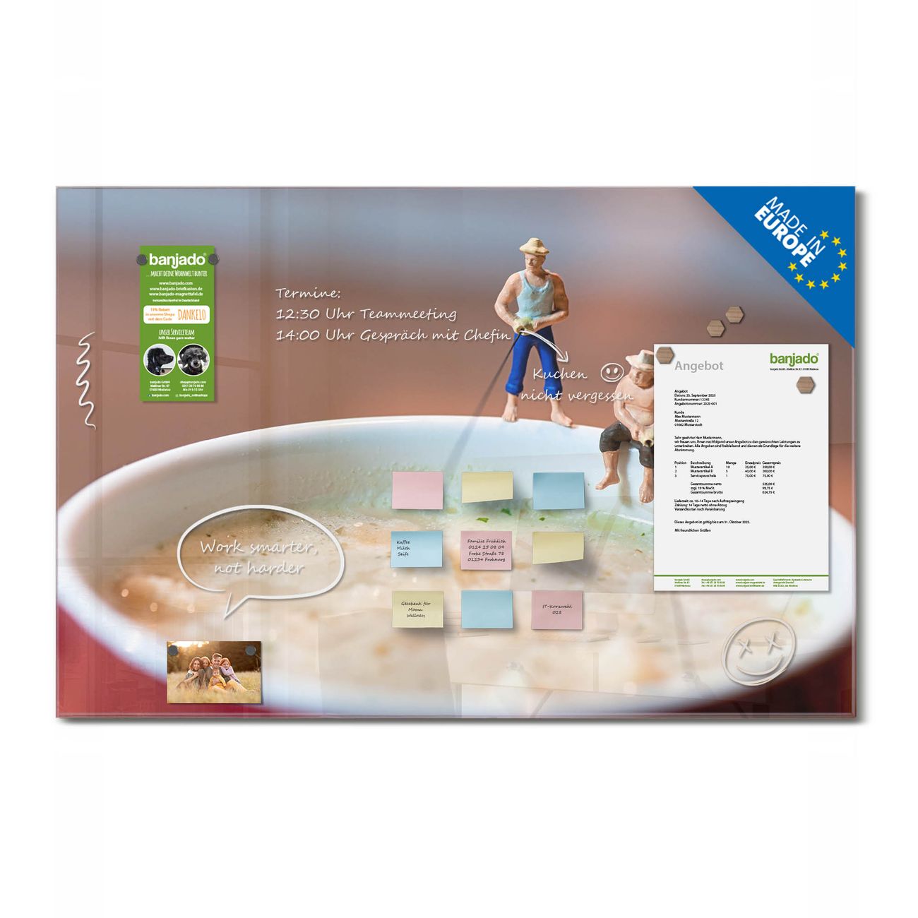 Jede Glas Magnettafel wird in unserer Werkstatt von Hand gefertigt und sorgfältig geprüft. So erhalten Sie ein echtes Qualitätsprodukt, das Funktion und Ästhetik perfekt vereint.?? Warum banjado?
