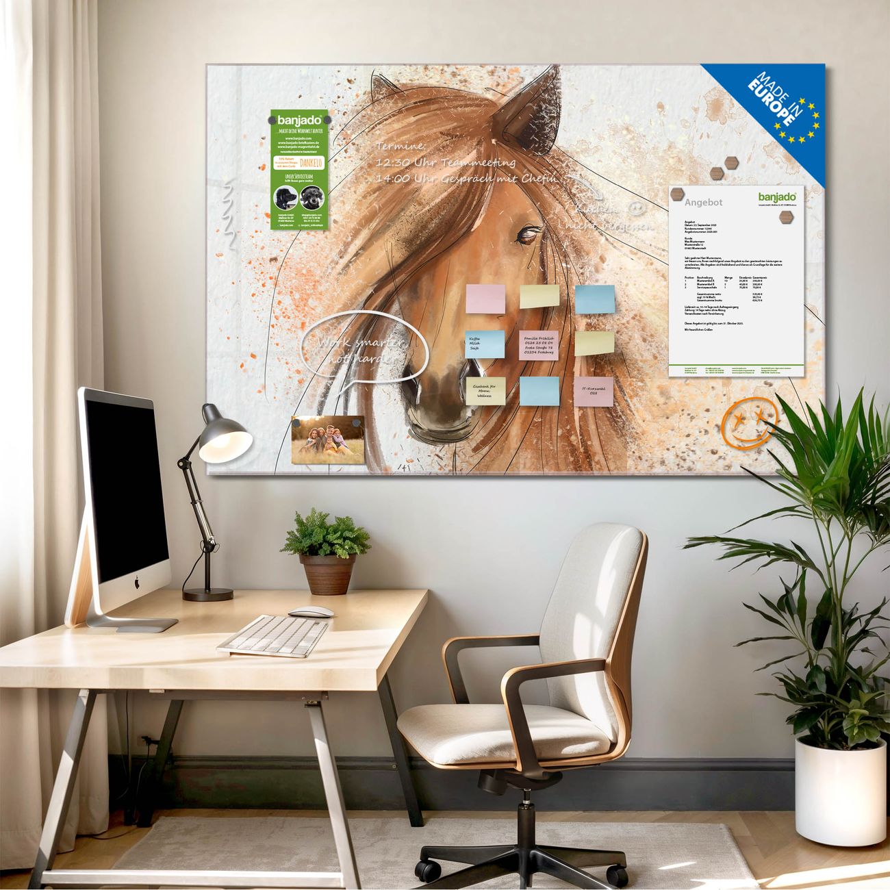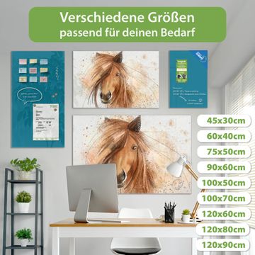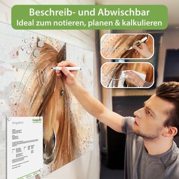 Die banjado Glas Magnettafel mit dem Motiv Motiv Magic Horse verbindet Funktionalität mit Stil. Sie ersetzt das Zettelchaos durch klare Strukturen und bringt dabei eine warme, natürliche Atmosphäre in Ihr Zuhause. Ob im Büro, in der Küche oder im Eingangsbereich - dieses Design-Board zieht Blicke an und sorgt für Ordnung mit Charakter.