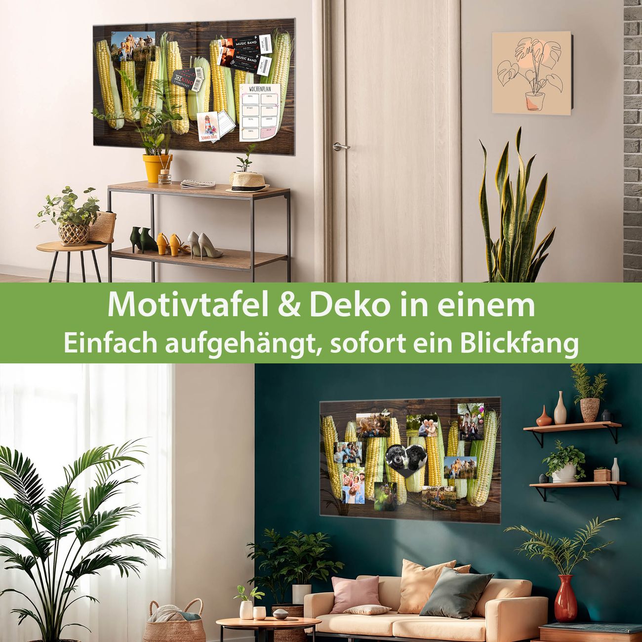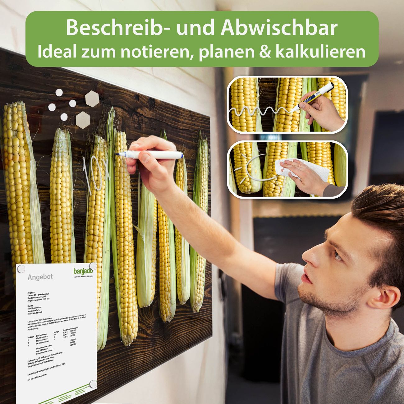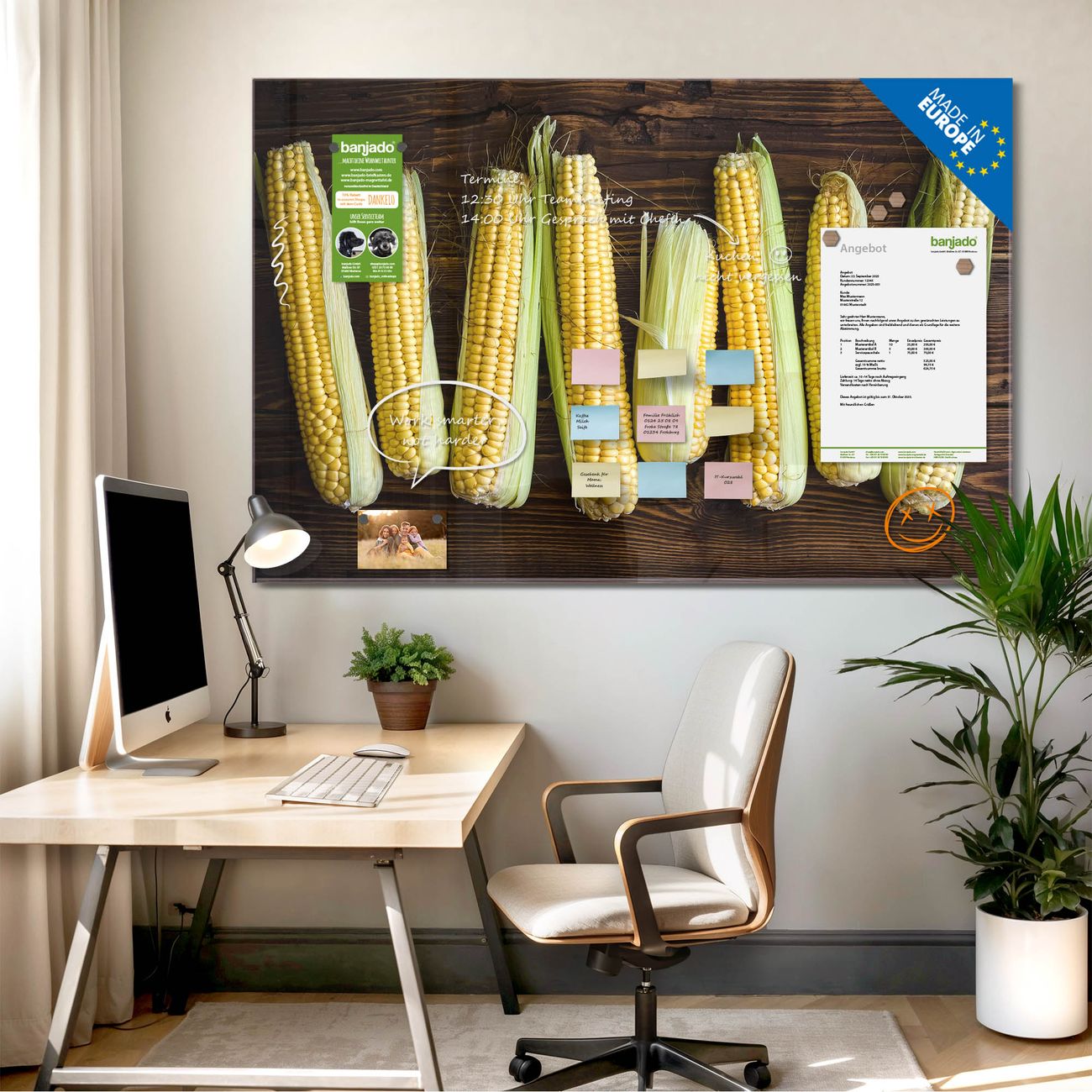 Die banjado Glas Magnettafel mit dem Motiv Motiv Maiskolben verbindet Funktionalität mit Stil. Sie ersetzt das Zettelchaos durch klare Strukturen und bringt dabei eine warme, natürliche Atmosphäre in Ihr Zuhause. Ob im Büro, in der Küche oder im Eingangsbereich - dieses Design-Board zieht Blicke an und sorgt für Ordnung mit Charakter.