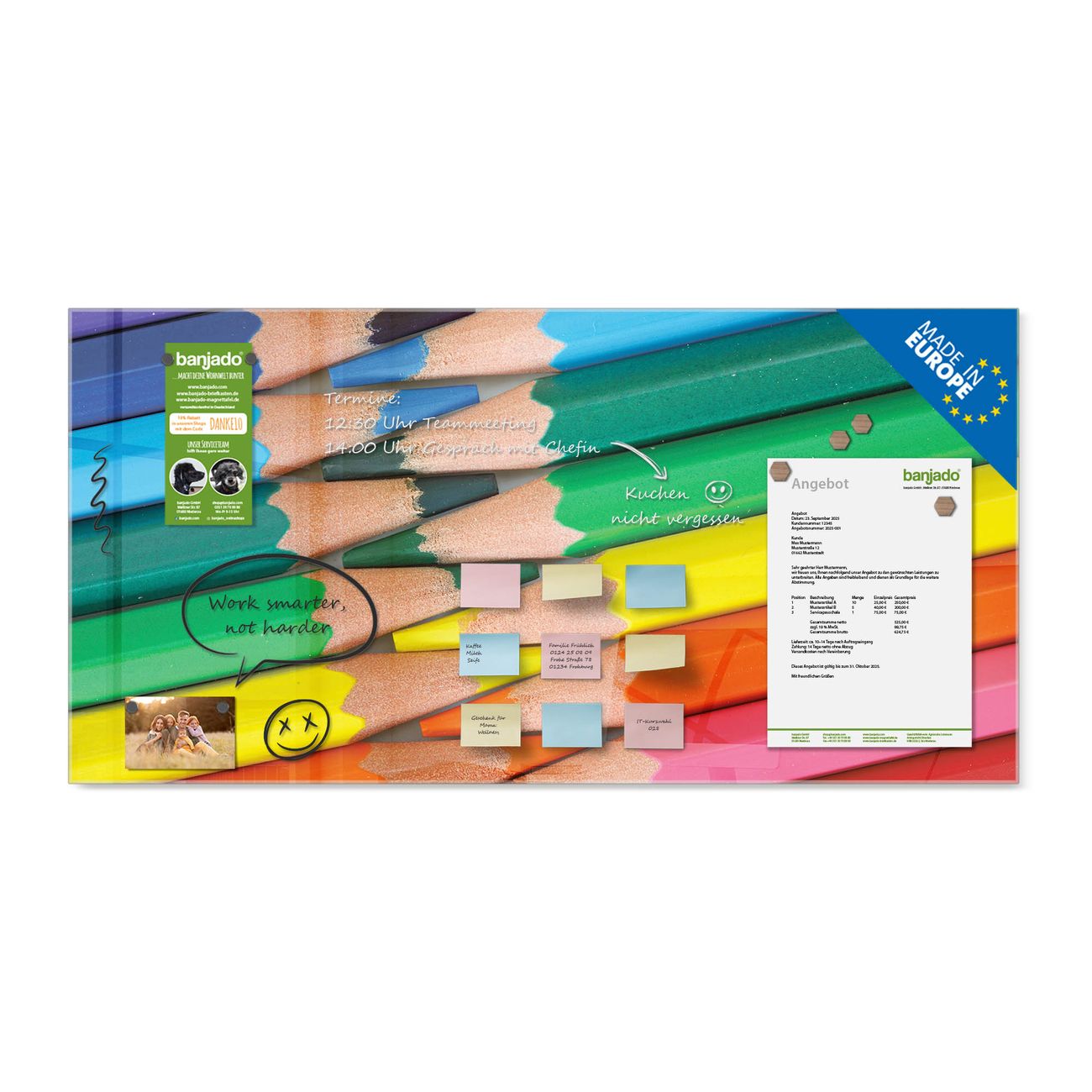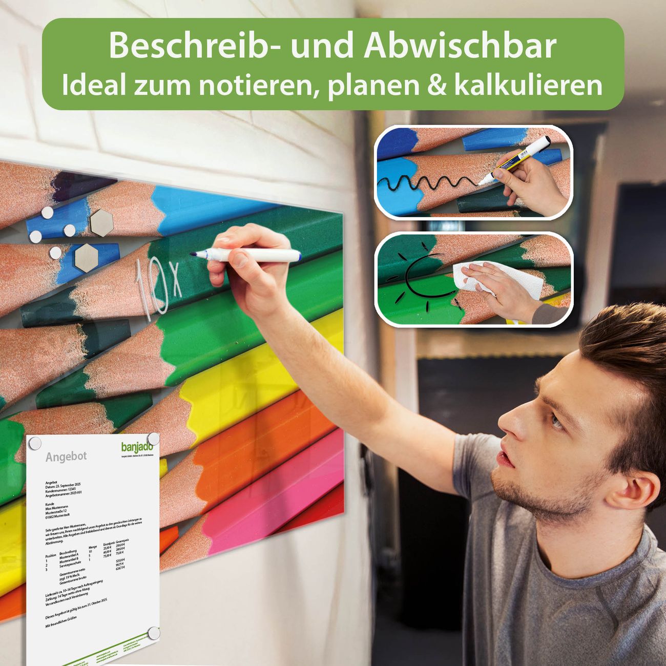 Jede Glas Magnettafel wird in unserer Werkstatt von Hand gefertigt und sorgfältig geprüft. So erhalten Sie ein echtes Qualitätsprodukt, das Funktion und Ästhetik perfekt vereint.?? Warum banjado?