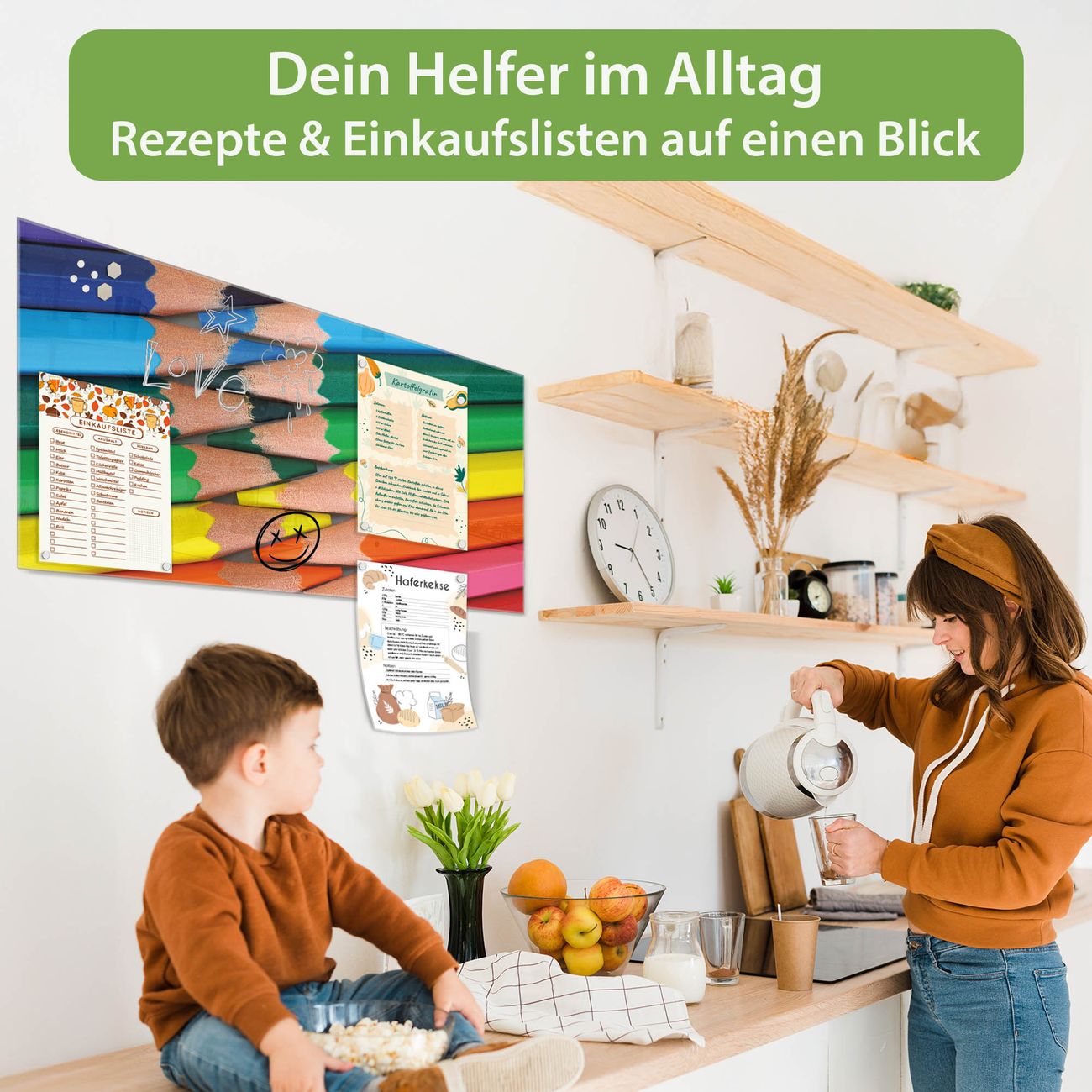 Auf der glatten Glasoberfläche lassen sich Termine, Rezepte oder Notizen ganz einfach mit Kreidestiften festhalten und rückstandslos entfernen. Starke Neodym-Magnete halten Ihre wichtigsten Erinnerungen sicher an Ort und Stelle. So entsteht Ihre ganz persönliche Ideenwand - jeden Tag neu.