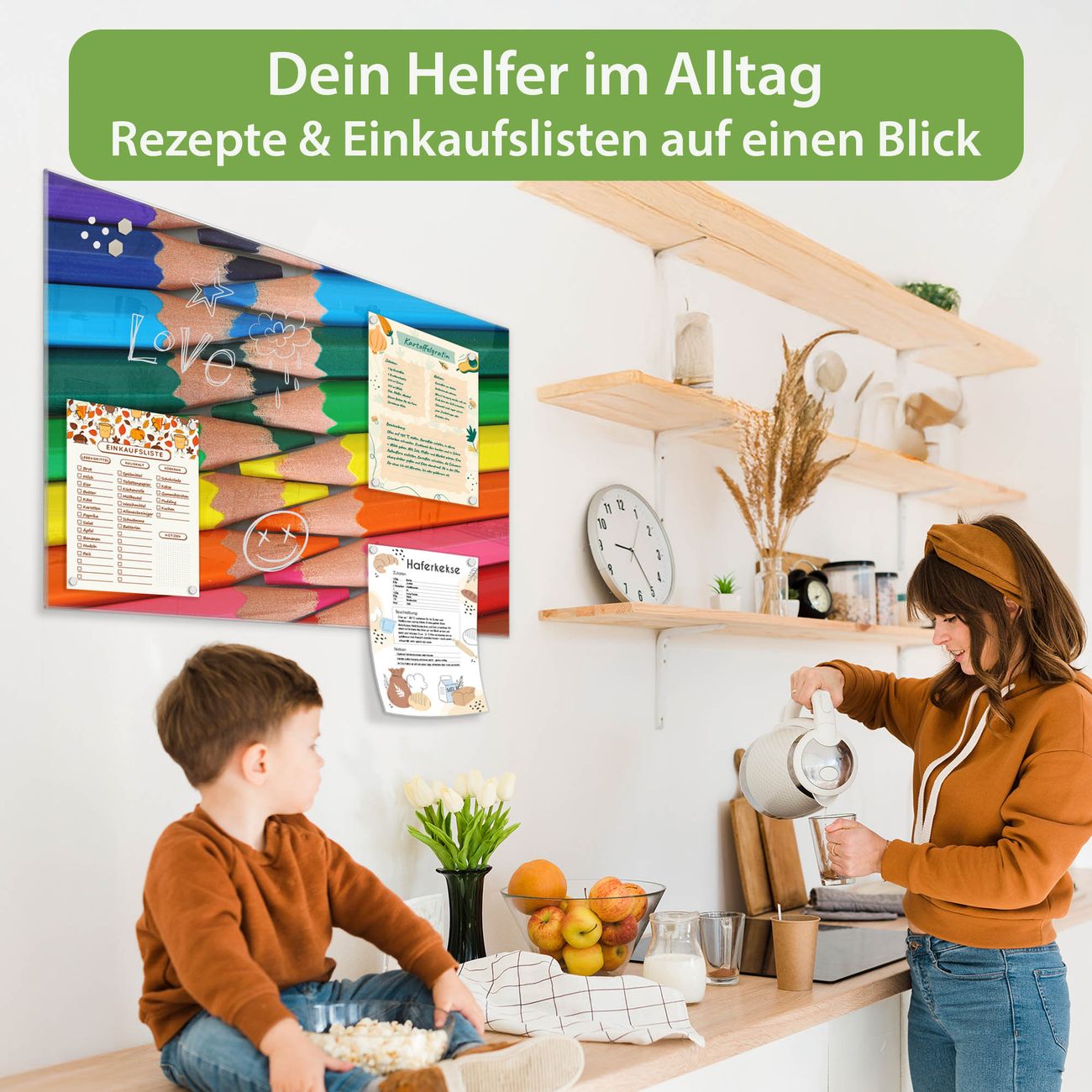 Auf der glatten Glasoberfläche lassen sich Termine, Rezepte oder Notizen ganz einfach mit Kreidestiften festhalten und rückstandslos entfernen. Starke Neodym-Magnete halten Ihre wichtigsten Erinnerungen sicher an Ort und Stelle. So entsteht Ihre ganz persönliche Ideenwand - jeden Tag neu.
