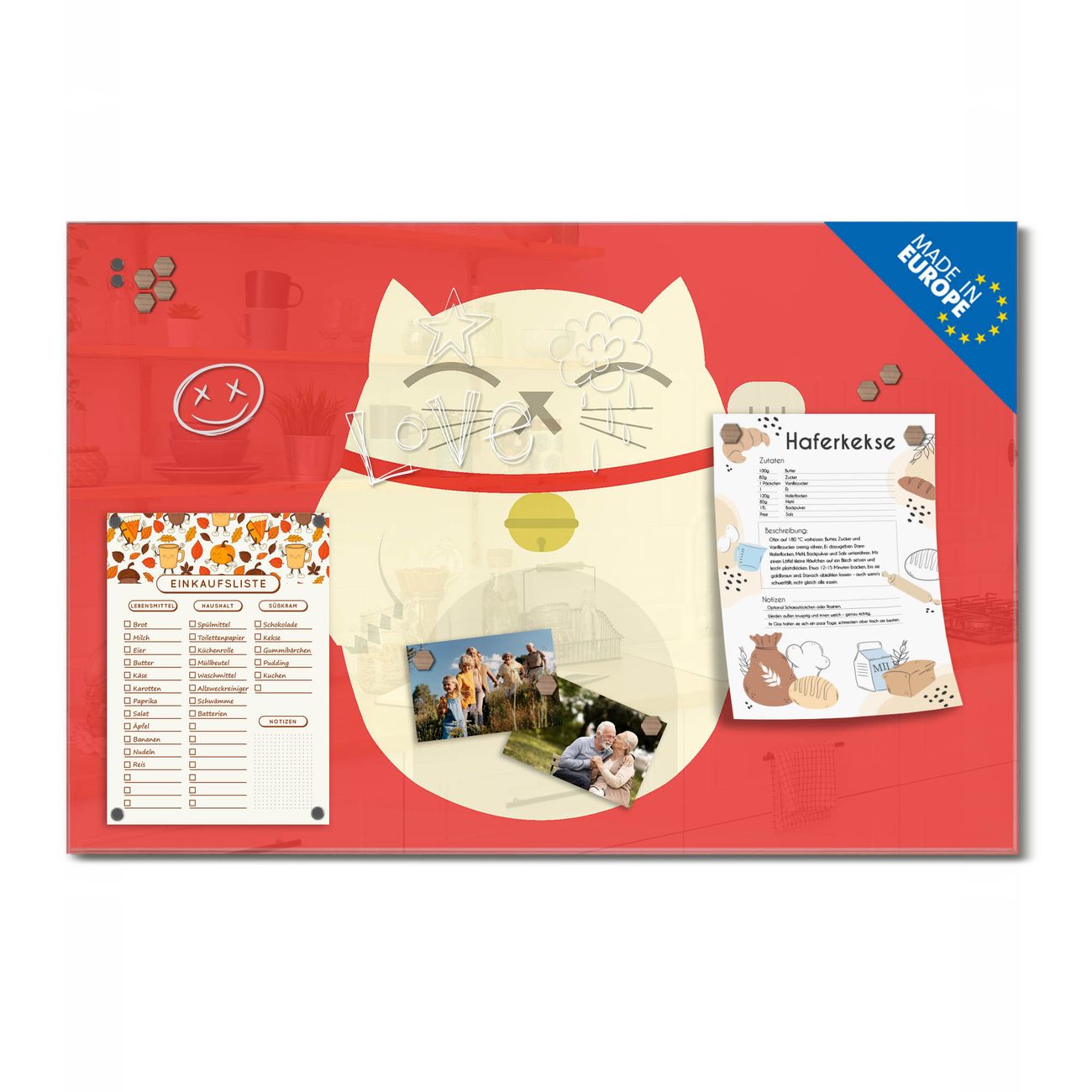 Ein Stück Design, das Ihren Alltag organisiert. Schreiben, heften, inspirieren - alles an einem Ort. Qualität, die man spürt. Montage leicht gemacht. Handwerk mit Herz - veredelt in Sachsen. Einzigartiges Design mit Motiv Motiv Manekineko Beschreibbare Glasoberfläche, leicht zu reinigen Starke Magnetkraft durch Stahlrückwand Inklusive 4 Neodym-Magneten Flexible Montageoptionen Handveredelt in Sachsen - Qualität, die bleibt
