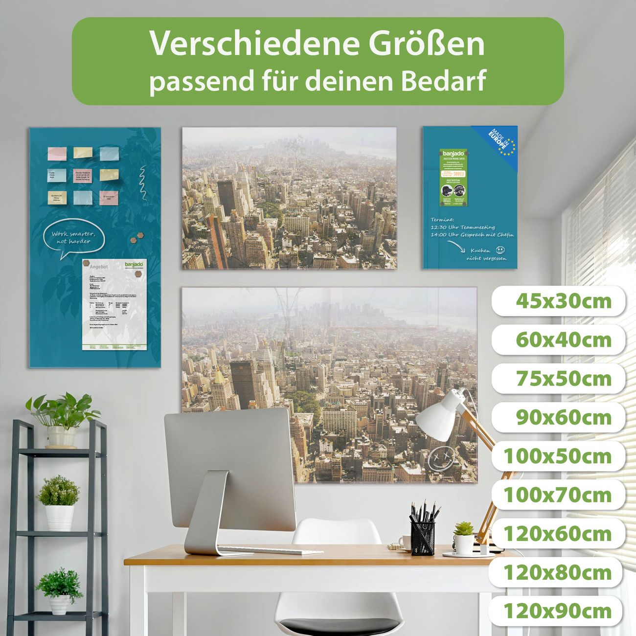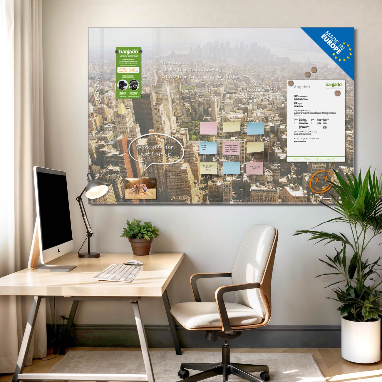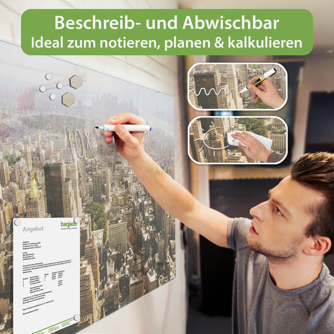 Jede Glas Magnettafel wird in unserer Werkstatt von Hand gefertigt und sorgfältig geprüft. So erhalten Sie ein echtes Qualitätsprodukt, das Funktion und Ästhetik perfekt vereint.?? Warum banjado?