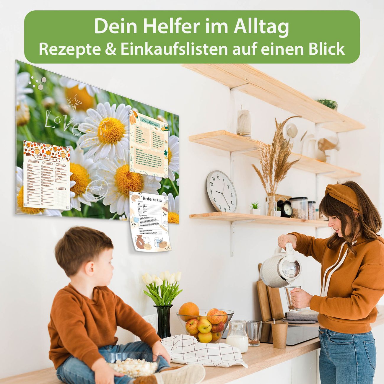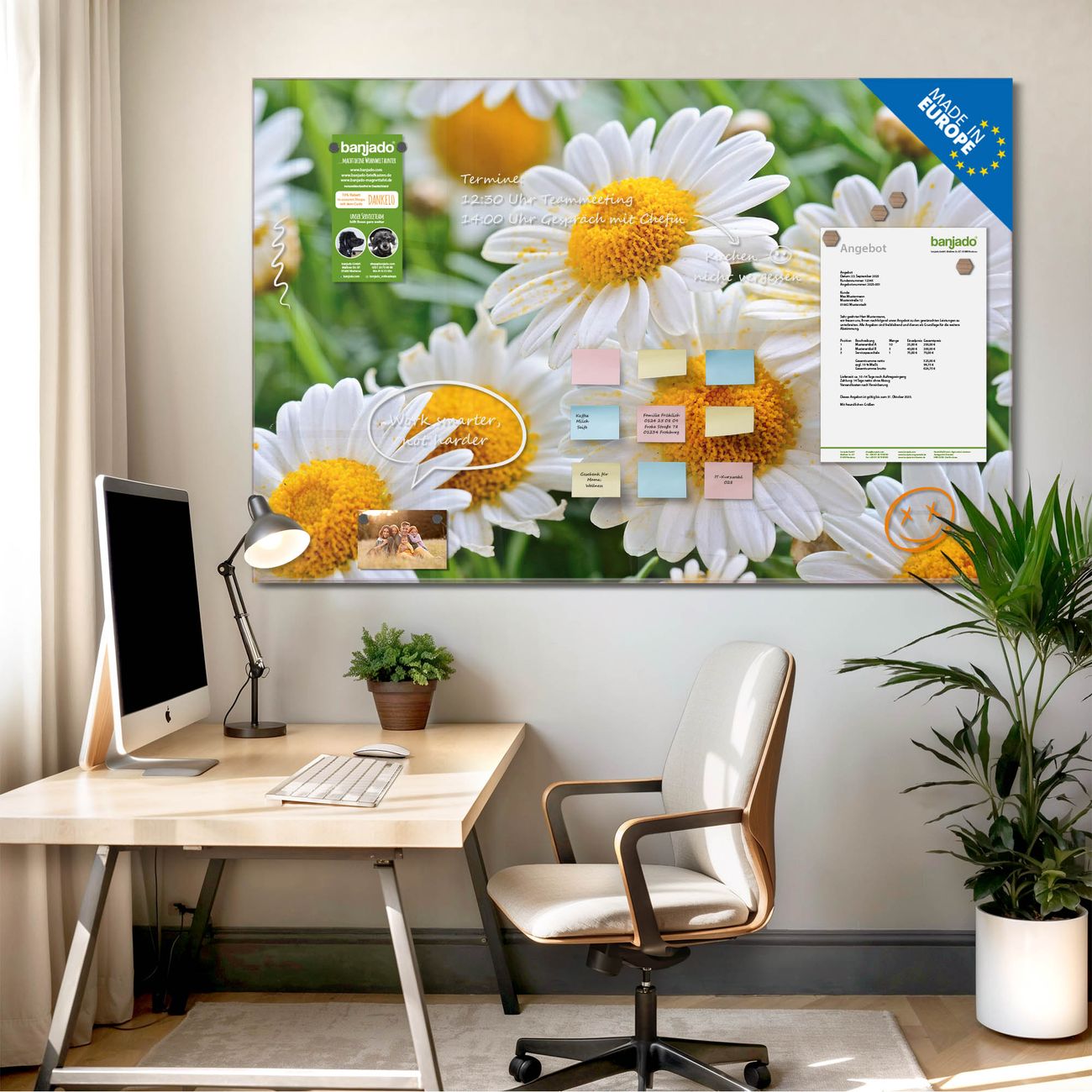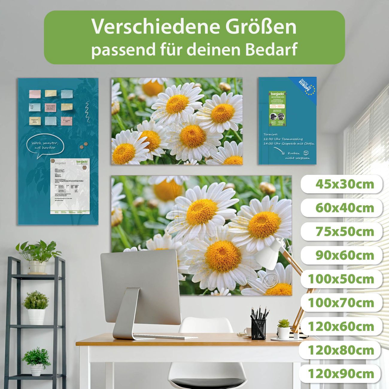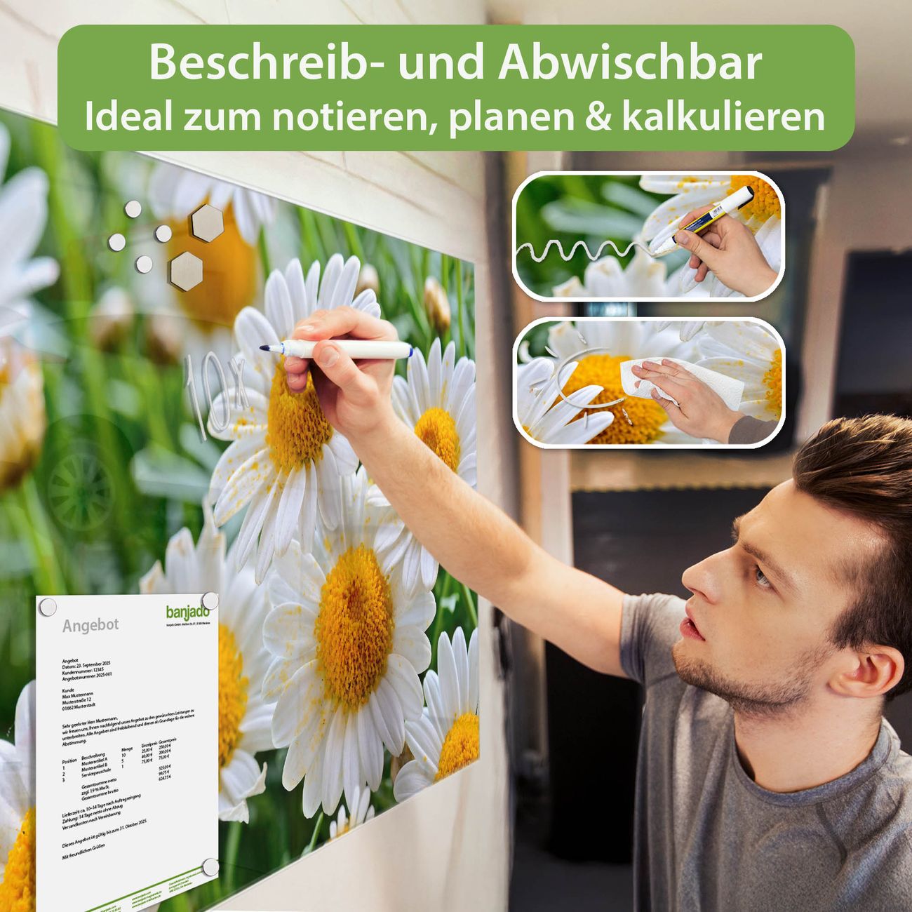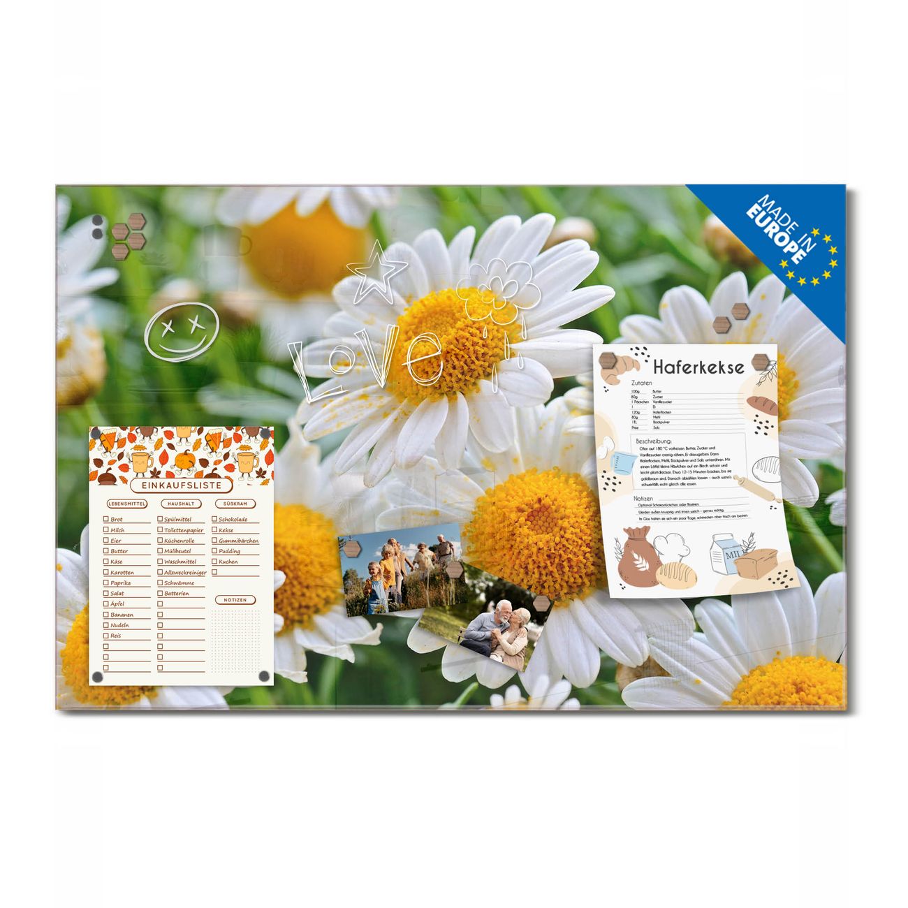 Ein Stück Design, das Ihren Alltag organisiert. Schreiben, heften, inspirieren - alles an einem Ort. Qualität, die man spürt. Montage leicht gemacht. Handwerk mit Herz - veredelt in Sachsen. Einzigartiges Design mit Motiv Motiv Margeriten Illustration Beschreibbare Glasoberfläche, leicht zu reinigen Starke Magnetkraft durch Stahlrückwand Inklusive 4 Neodym-Magneten Flexible Montageoptionen Handveredelt in Sachsen - Qualität, die bleibt