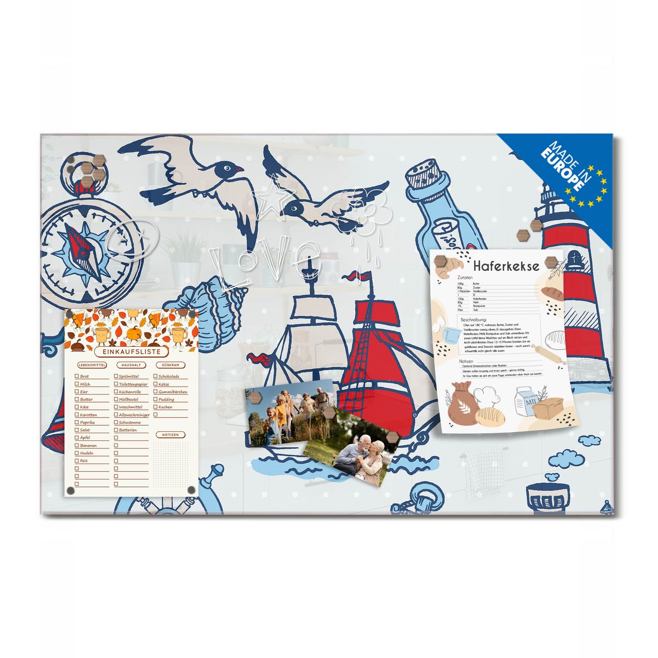 Ein Stück Design, das Ihren Alltag organisiert. Schreiben, heften, inspirieren - alles an einem Ort. Qualität, die man spürt. Montage leicht gemacht. Handwerk mit Herz - veredelt in Sachsen. Einzigartiges Design mit Motiv Motiv Schiff Ahoj Beschreibbare Glasoberfläche, leicht zu reinigen Starke Magnetkraft durch Stahlrückwand Inklusive 4 Neodym-Magneten Flexible Montageoptionen Handveredelt in Sachsen - Qualität, die bleibt