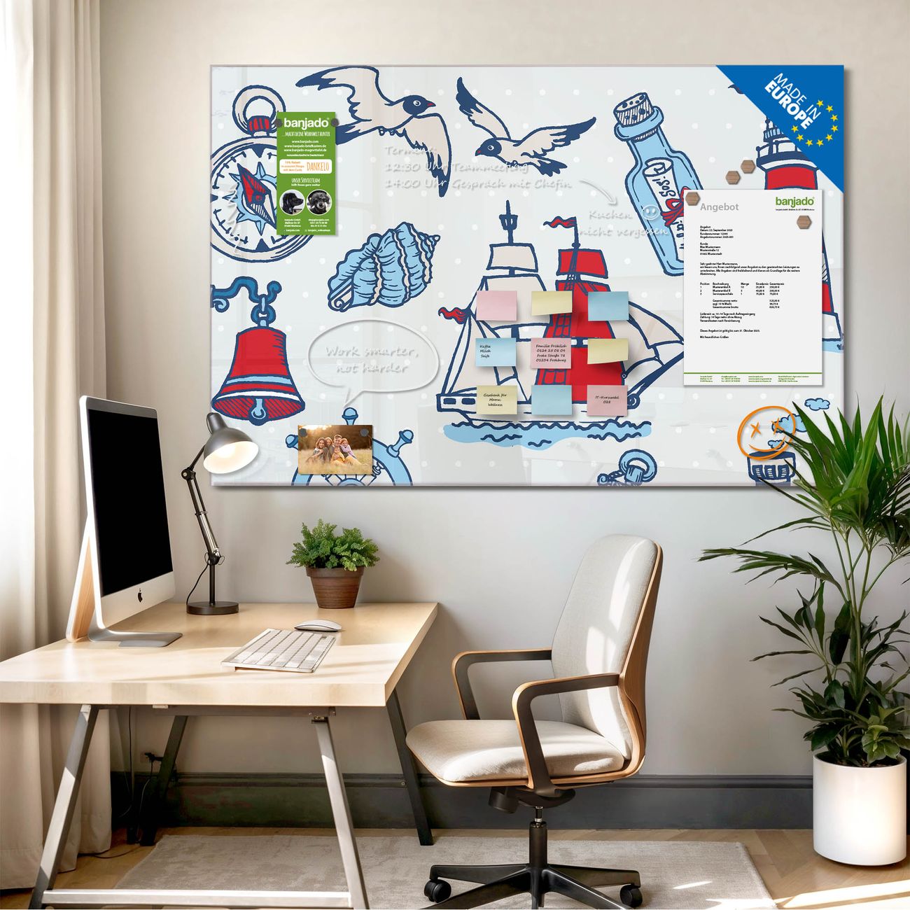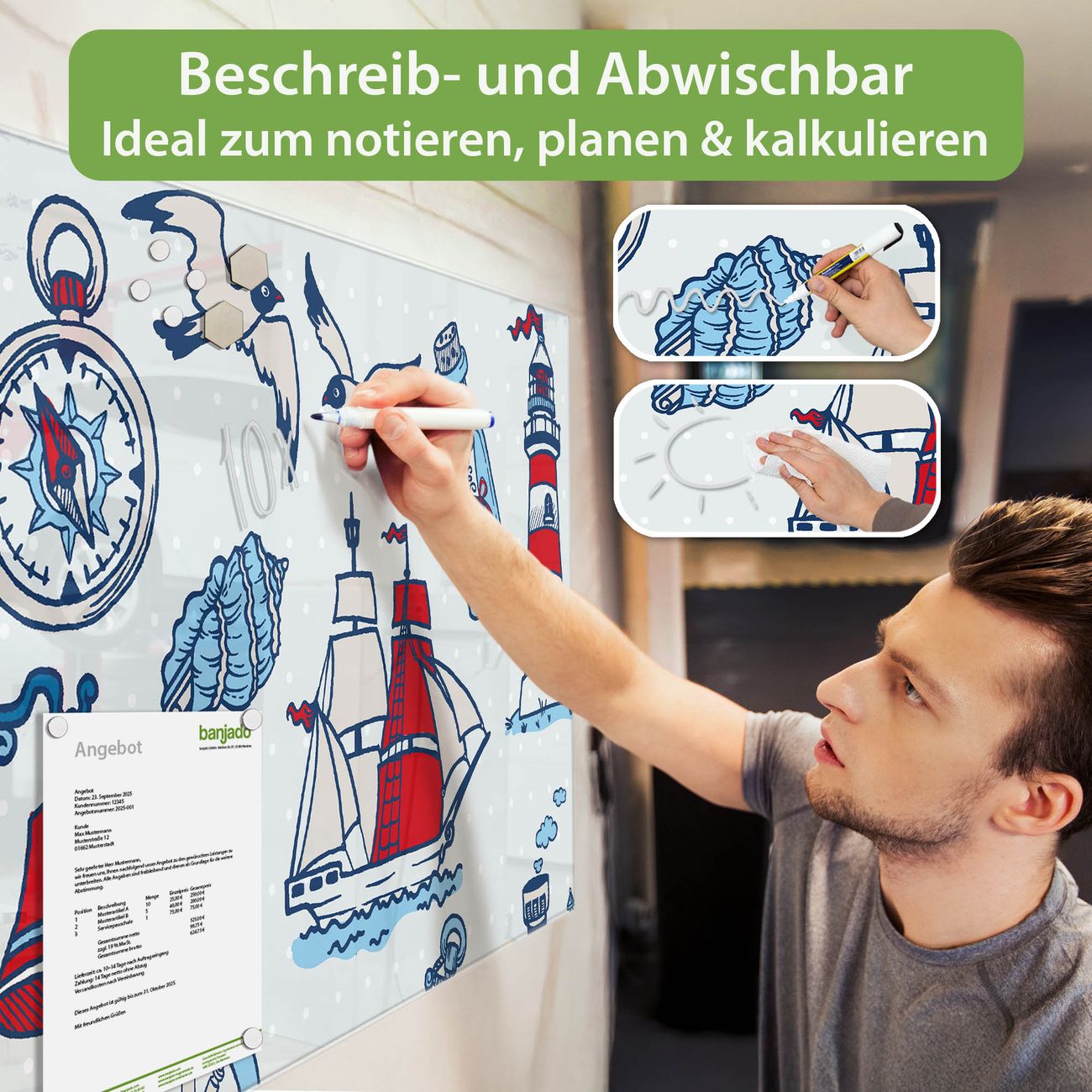 Jede Glas Magnettafel wird in unserer Werkstatt von Hand gefertigt und sorgfältig geprüft. So erhalten Sie ein echtes Qualitätsprodukt, das Funktion und Ästhetik perfekt vereint.?? Warum banjado?