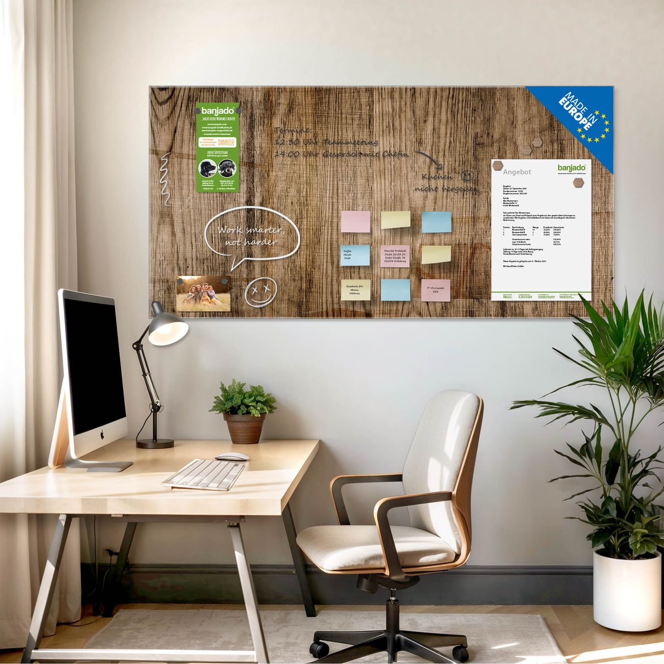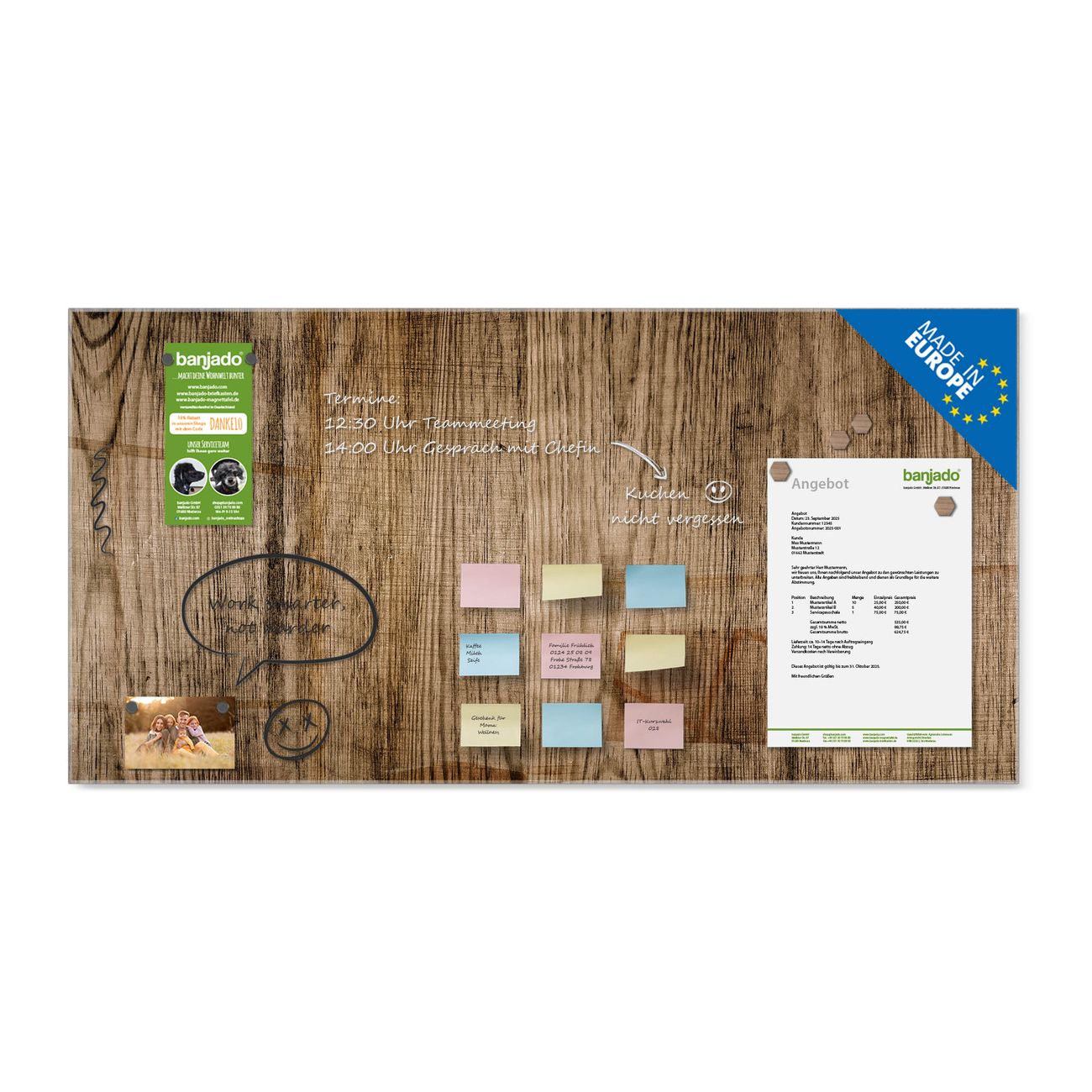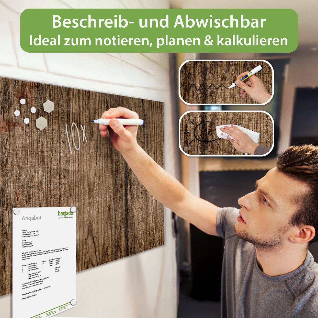 Jede Glas Magnettafel wird in unserer Werkstatt von Hand gefertigt und sorgfältig geprüft. So erhalten Sie ein echtes Qualitätsprodukt, das Funktion und Ästhetik perfekt vereint.?? Warum banjado?