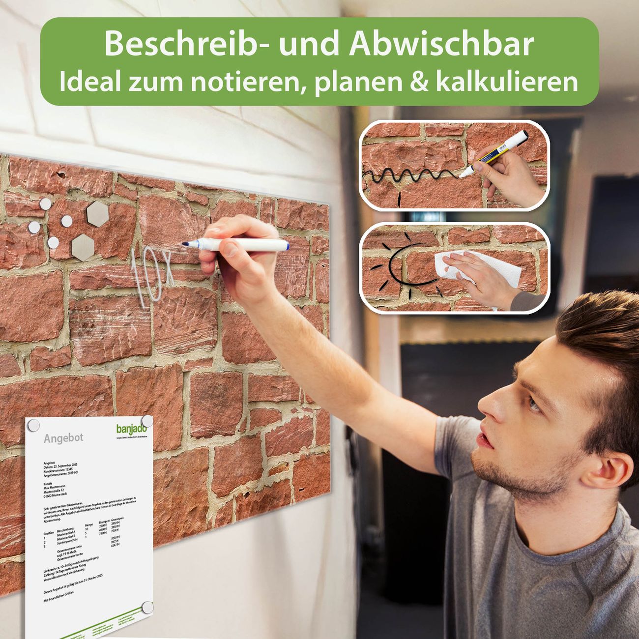 Die banjado Glas Magnettafel mit dem Motiv Motiv Mauerwerk verbindet Funktionalität mit Stil. Sie ersetzt das Zettelchaos durch klare Strukturen und bringt dabei eine warme, natürliche Atmosphäre in Ihr Zuhause. Ob im Büro, in der Küche oder im Eingangsbereich - dieses Design-Board zieht Blicke an und sorgt für Ordnung mit Charakter.