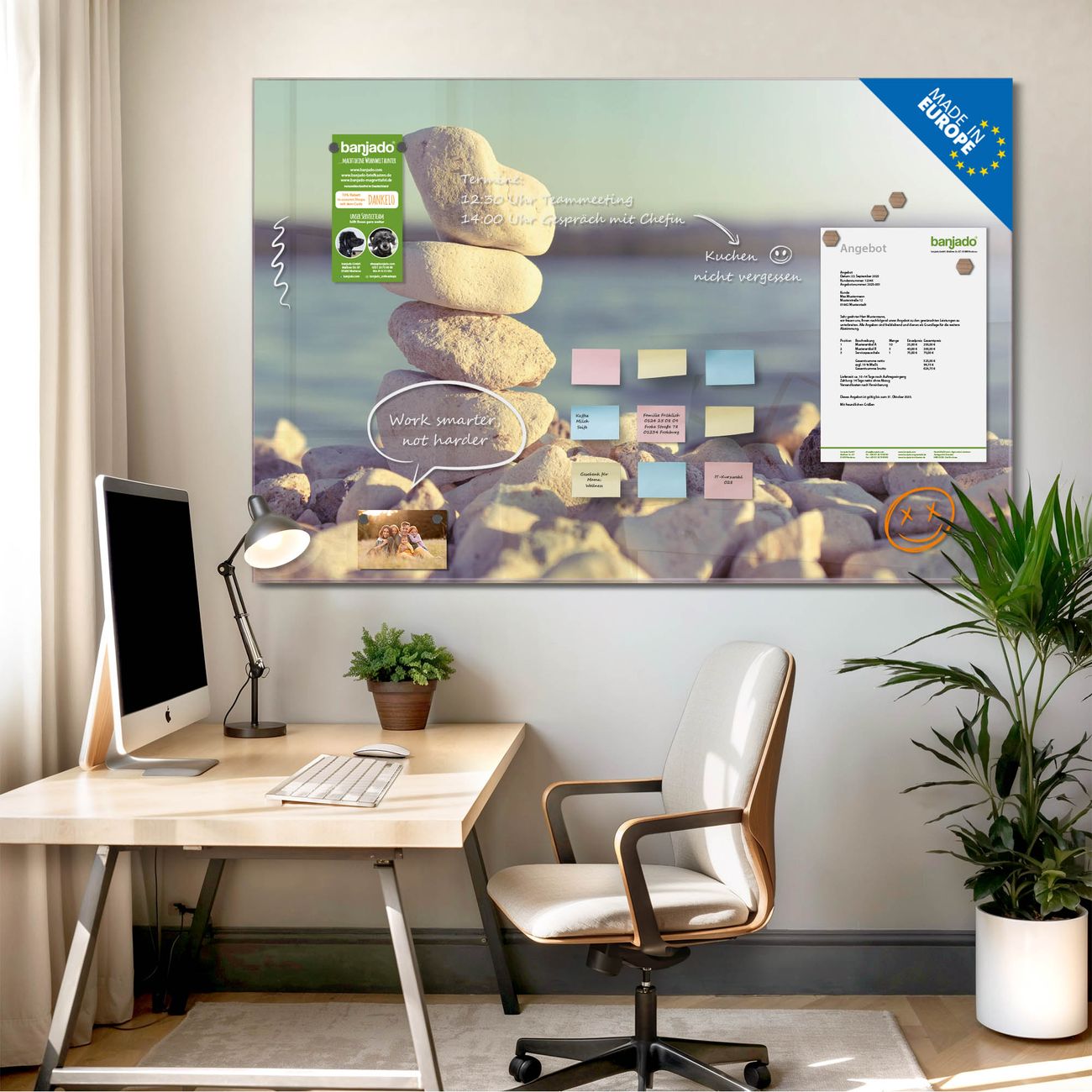 Jede Glas Magnettafel wird in unserer Werkstatt von Hand gefertigt und sorgfältig geprüft. So erhalten Sie ein echtes Qualitätsprodukt, das Funktion und Ästhetik perfekt vereint.?? Warum banjado?
