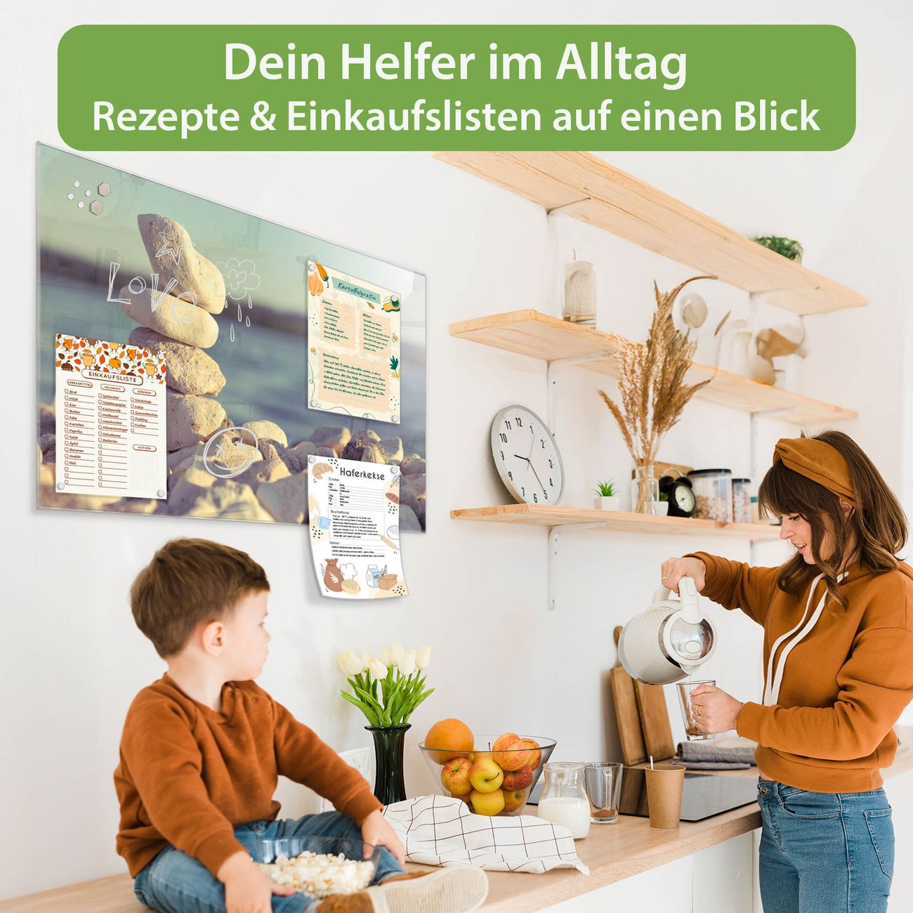Auf der glatten Glasoberfläche lassen sich Termine, Rezepte oder Notizen ganz einfach mit Kreidestiften festhalten und rückstandslos entfernen. Starke Neodym-Magnete halten Ihre wichtigsten Erinnerungen sicher an Ort und Stelle. So entsteht Ihre ganz persönliche Ideenwand - jeden Tag neu.