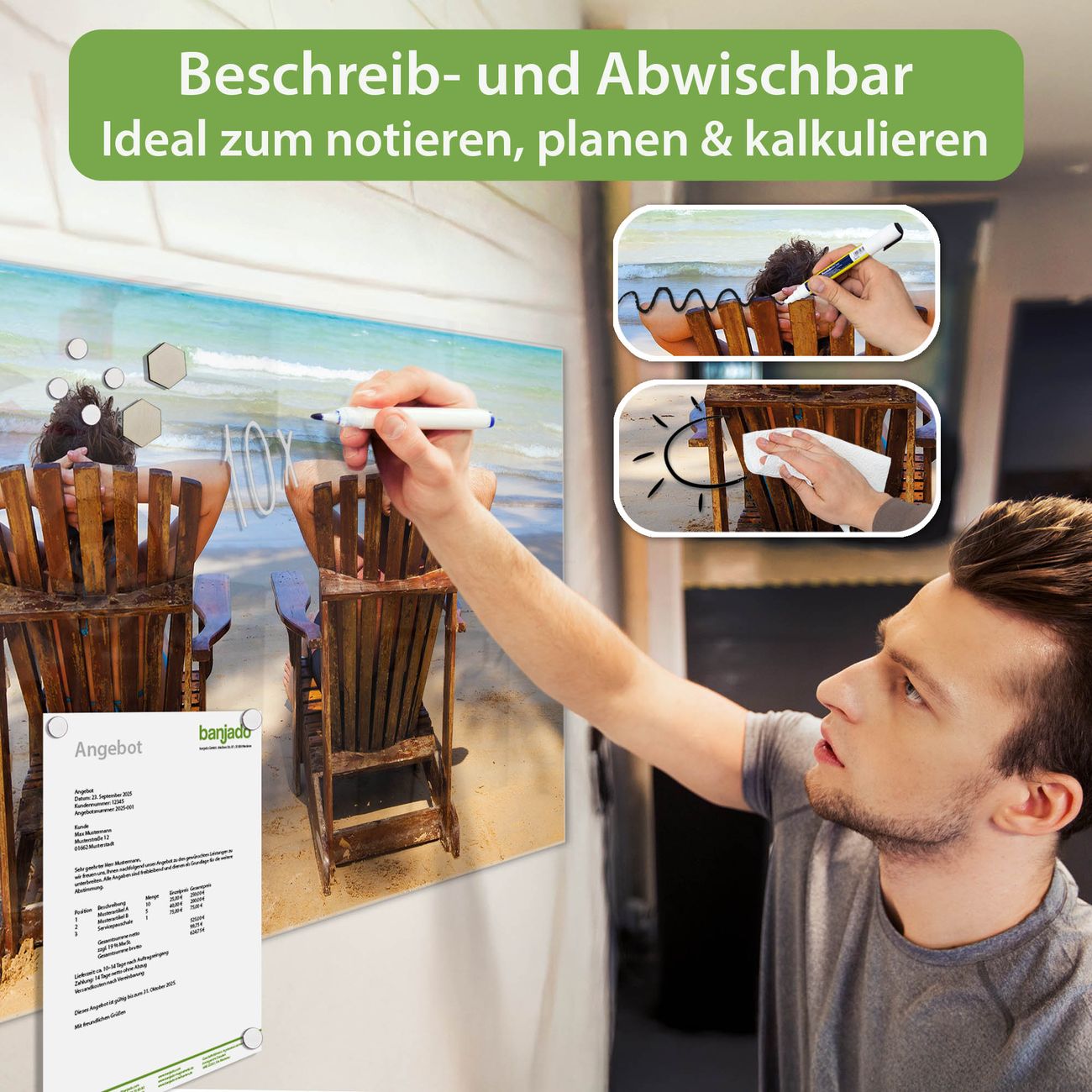 Bitte beachten Sie, dass ausschliessliche spezielle Magnete an der Glastafel haften. Wir empfehlen banjado Neodym Magnete, diese sind durch uns auf Wirksamkeit geprüft.