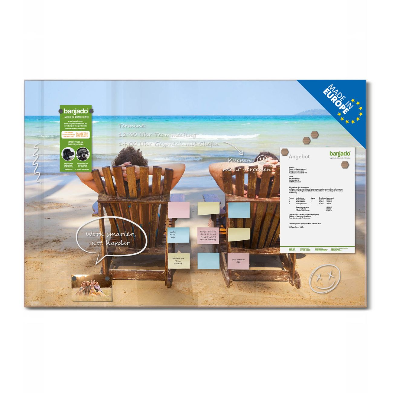 Jede Glas Magnettafel wird in unserer Werkstatt von Hand gefertigt und sorgfältig geprüft. So erhalten Sie ein echtes Qualitätsprodukt, das Funktion und Ästhetik perfekt vereint.?? Warum banjado?