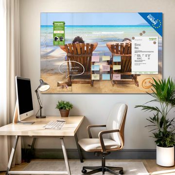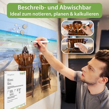 Auf der glatten Glasoberfläche lassen sich Termine, Rezepte oder Notizen ganz einfach mit Kreidestiften festhalten und rückstandslos entfernen. Starke Neodym-Magnete halten Ihre wichtigsten Erinnerungen sicher an Ort und Stelle. So entsteht Ihre ganz persönliche Ideenwand - jeden Tag neu.
