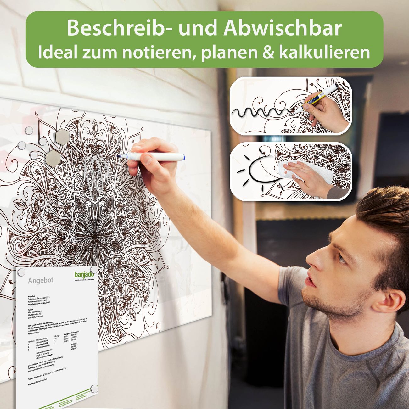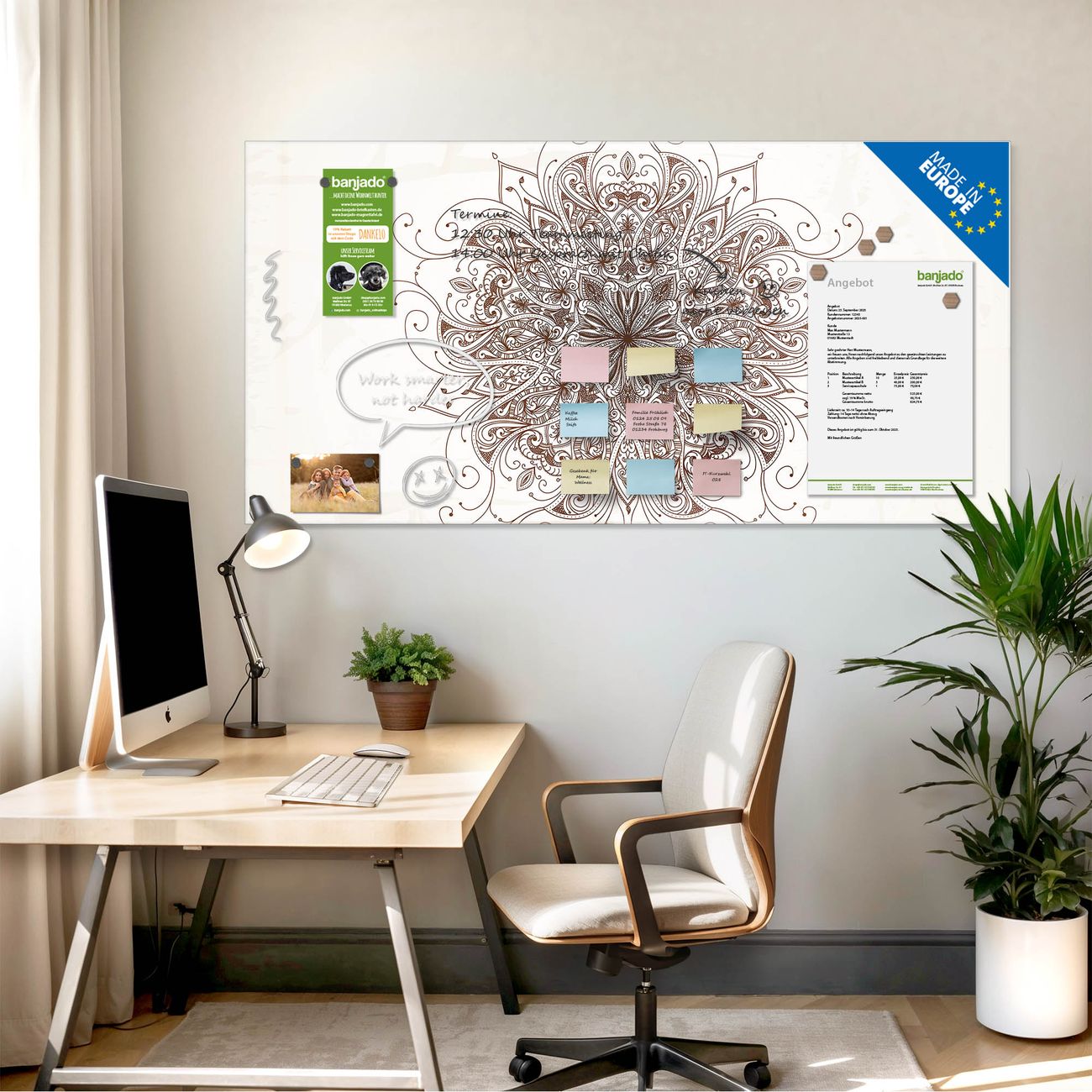 Die banjado Glas Magnettafel mit dem Motiv Motiv Mehendi verbindet Funktionalität mit Stil. Sie ersetzt das Zettelchaos durch klare Strukturen und bringt dabei eine warme, natürliche Atmosphäre in Ihr Zuhause. Ob im Büro, in der Küche oder im Eingangsbereich - dieses Design-Board zieht Blicke an und sorgt für Ordnung mit Charakter.