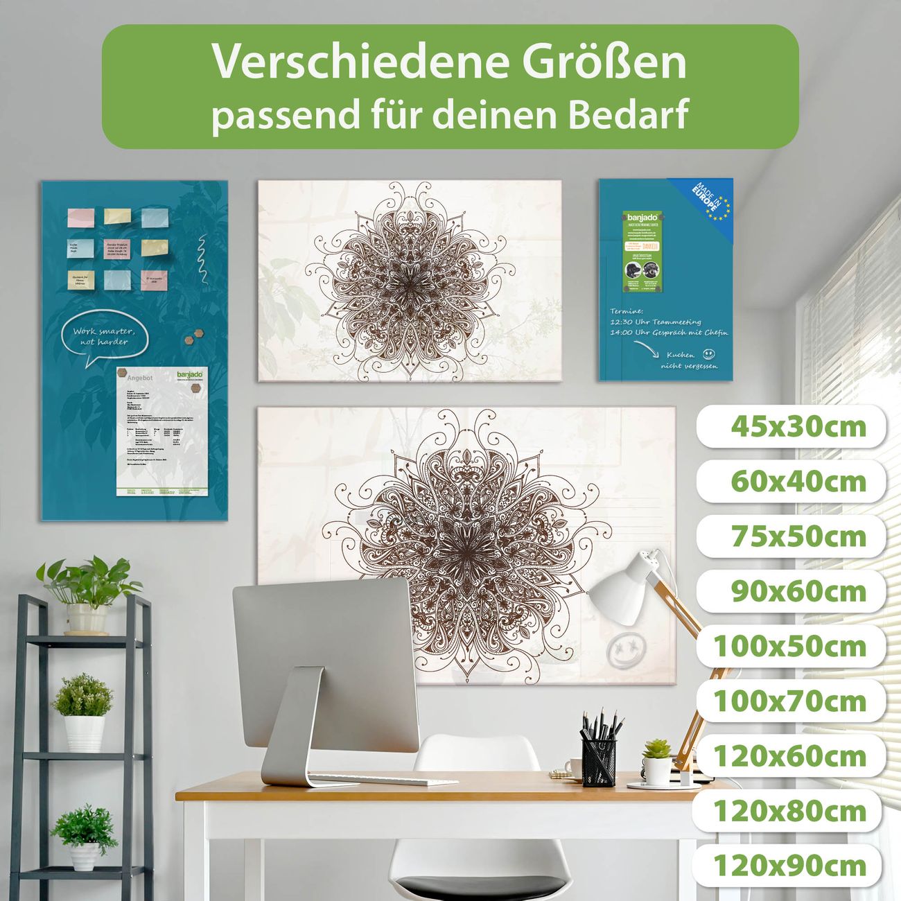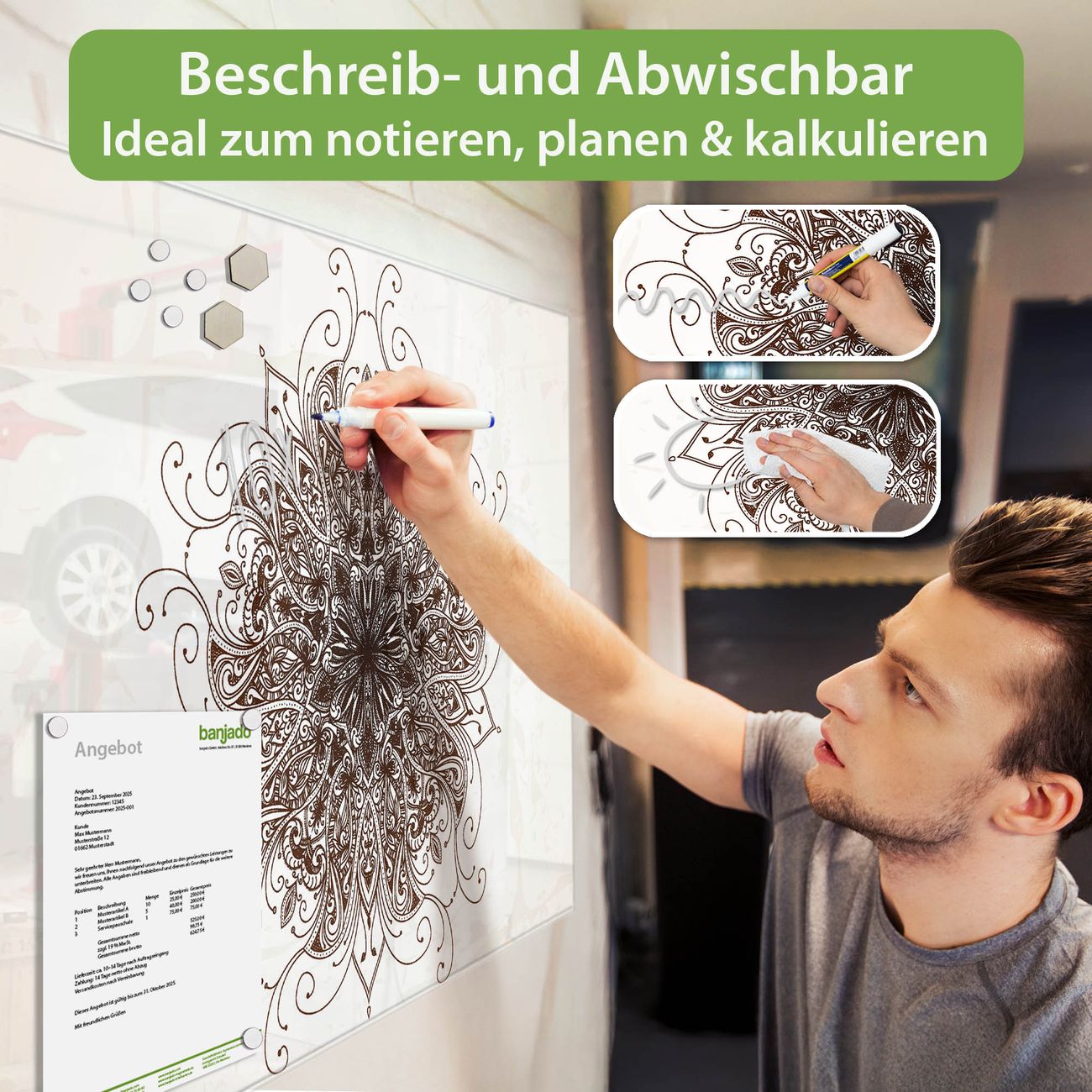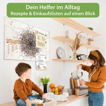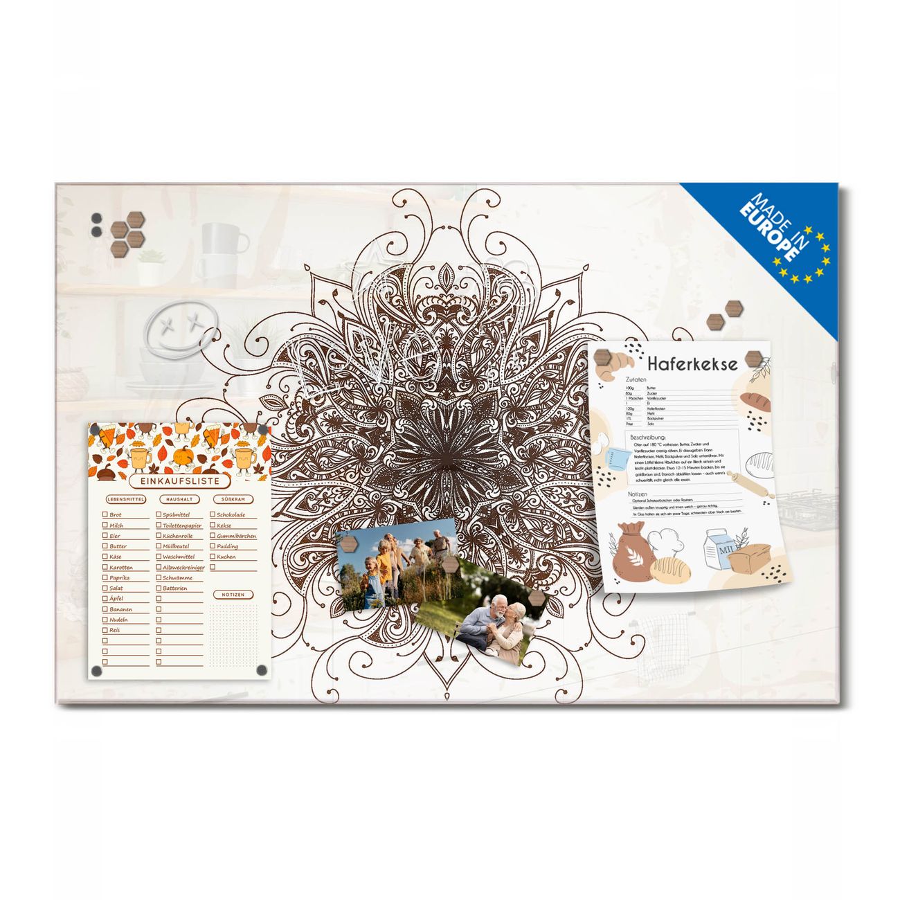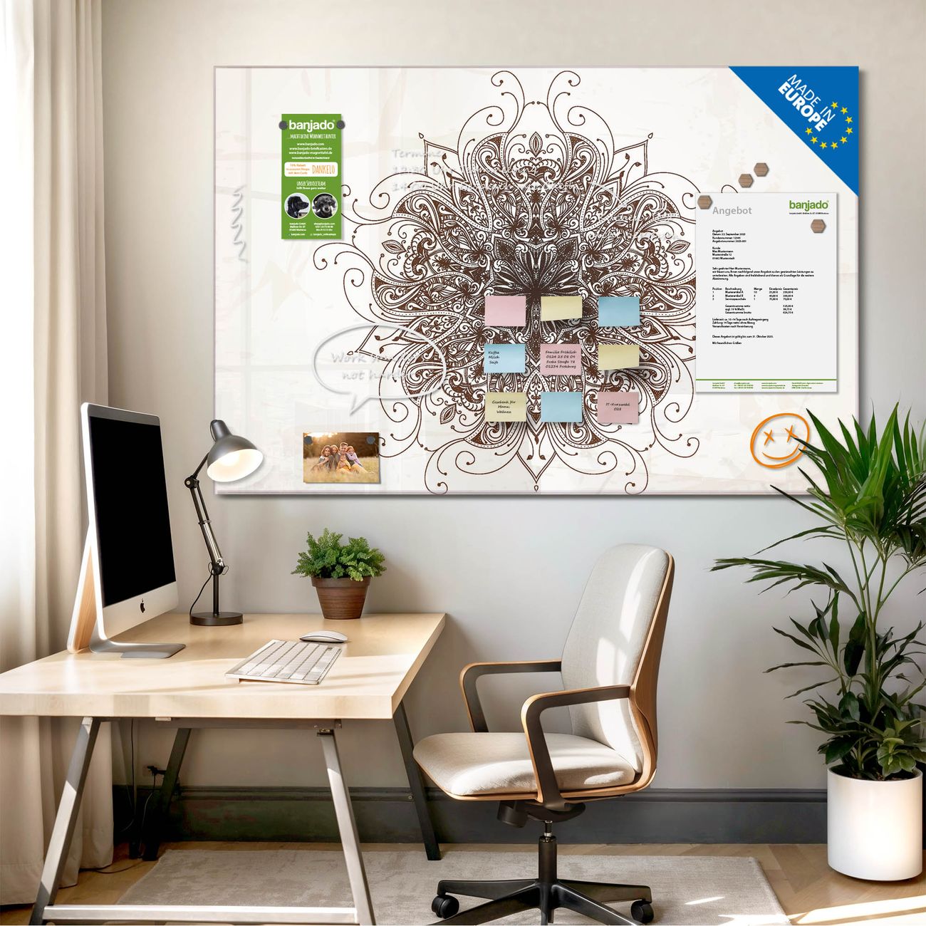 Die banjado Glas Magnettafel mit dem Motiv Motiv Mehendi verbindet Funktionalität mit Stil. Sie ersetzt das Zettelchaos durch klare Strukturen und bringt dabei eine warme, natürliche Atmosphäre in Ihr Zuhause. Ob im Büro, in der Küche oder im Eingangsbereich - dieses Design-Board zieht Blicke an und sorgt für Ordnung mit Charakter.
